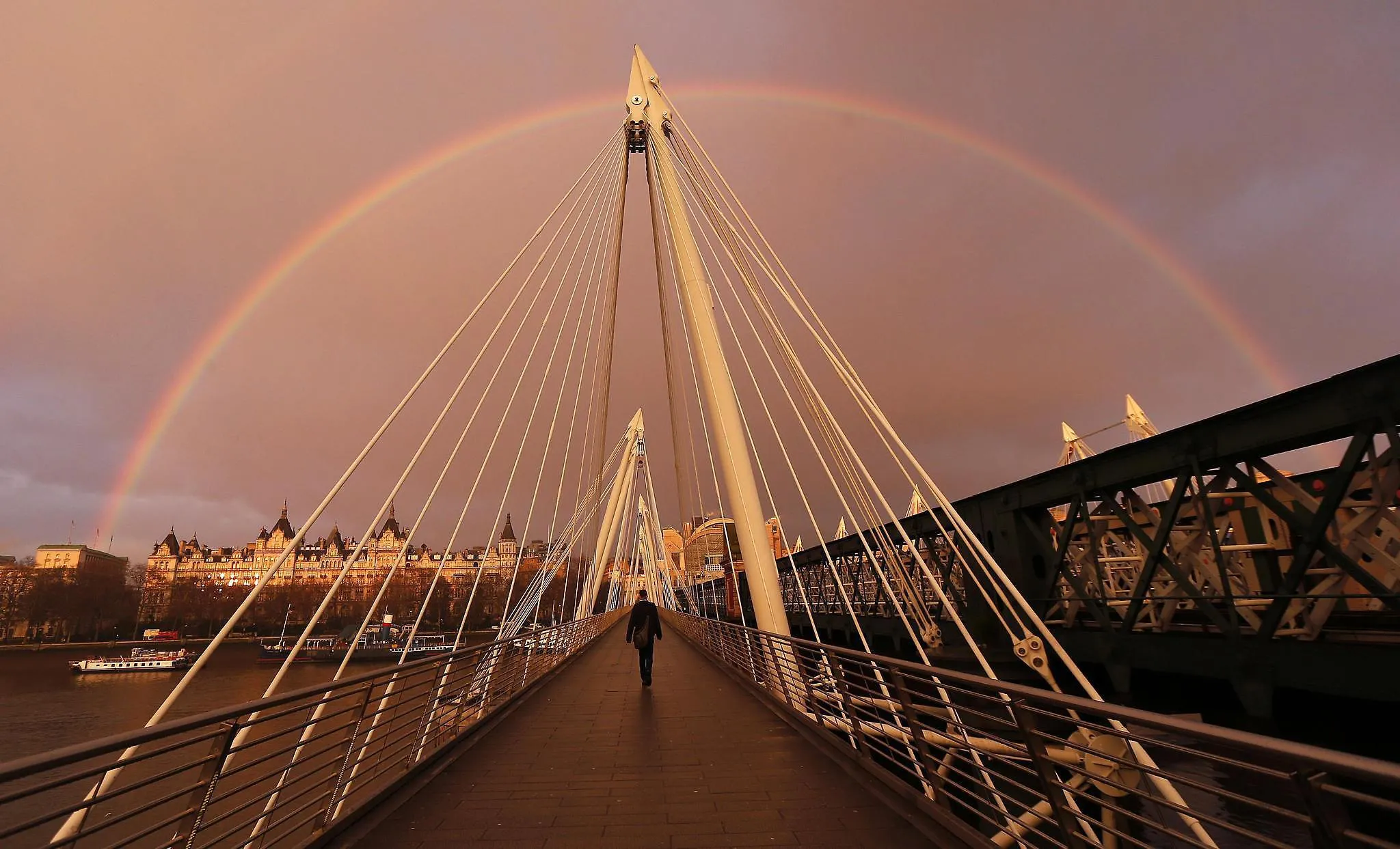 A rainbow appears as a pedestrian crosses the Hungerford Bridge in London January 31, 2014. (Photo by Suzanne Plunkett/Reuters)
