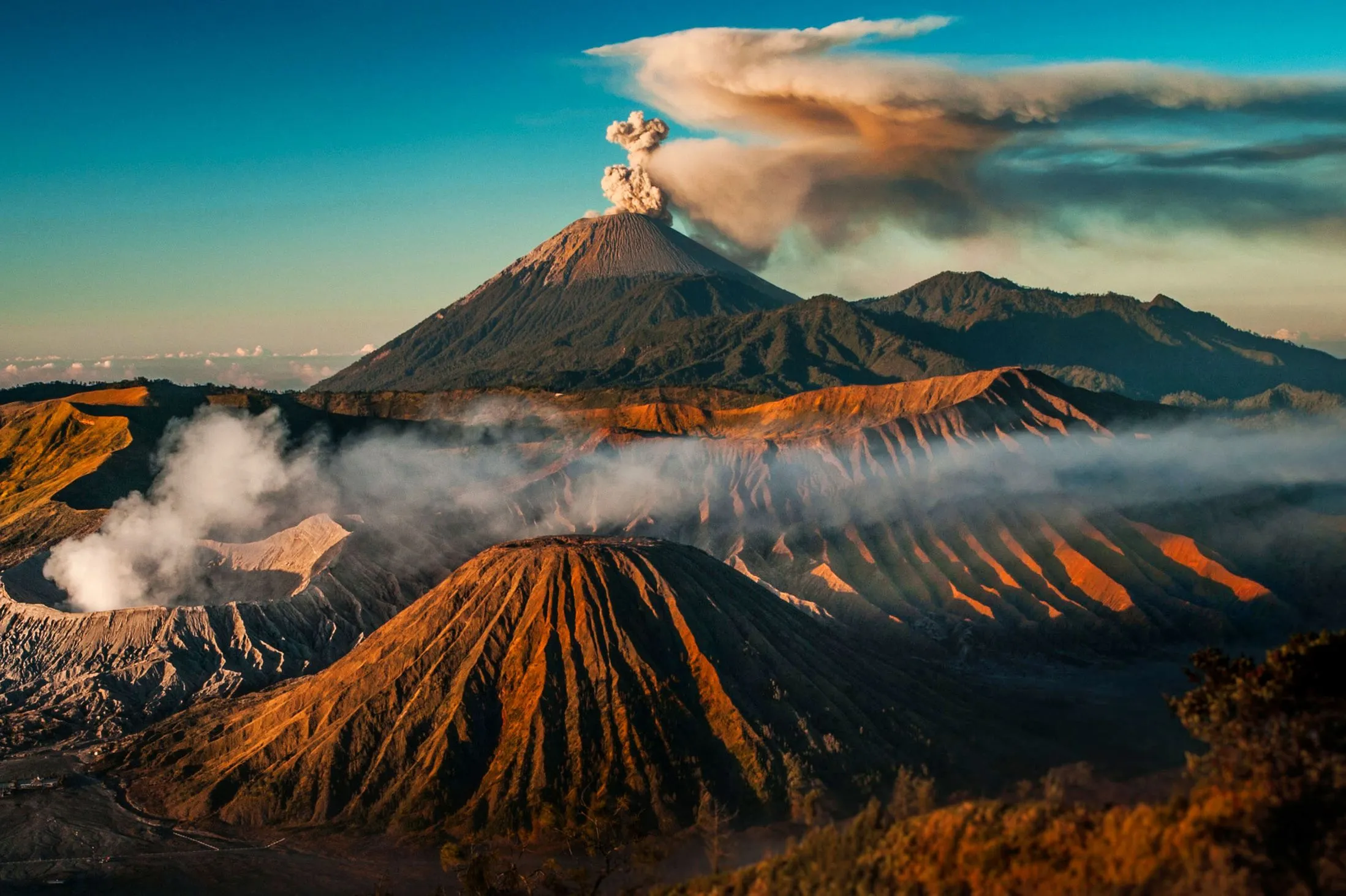 Primeval Tengger Caldera with active volcanoes Bromo in foreground and Semeru in background shortly after sunrise. (Photo by Caters News)