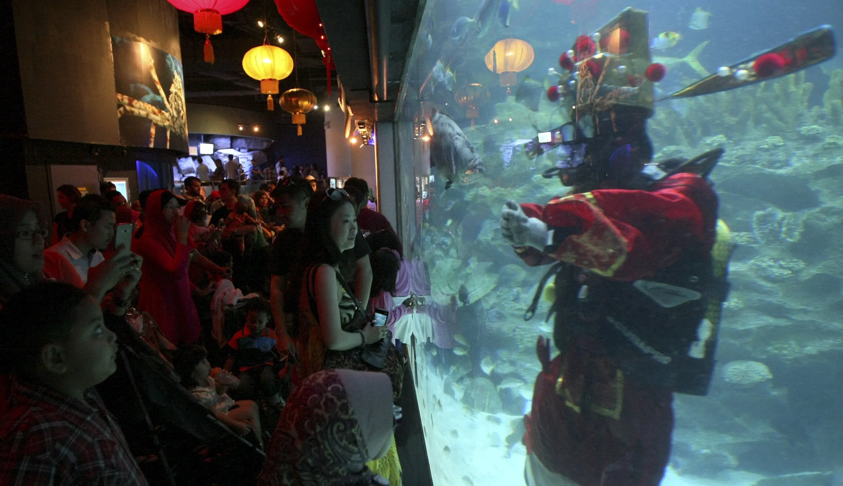 A diver dressed as God of Prosperity gestures to visitors on the first day of Chinese New Year celebrations at Aquaria KLCC underwater park in Kuala Lumpur, Malaysia, Friday, January 31, 2014. (Photo by Daniel Chan/AP Photo)