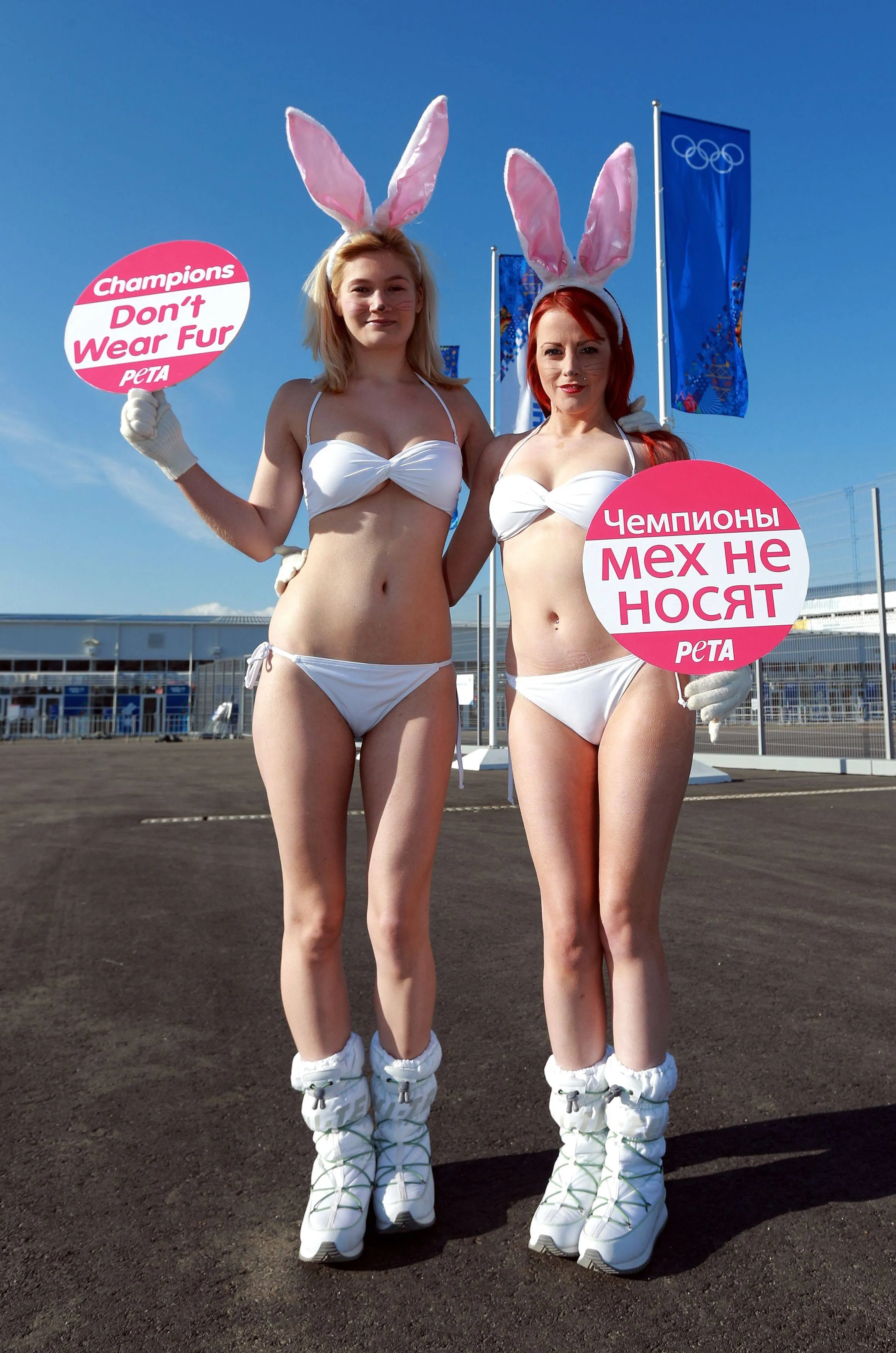 Two PETA Supporters protest against the wearing of fur at the Olympic Park in Sochi, Russia, on February 4, 2014. (Photo by David Davies/PA Wire)