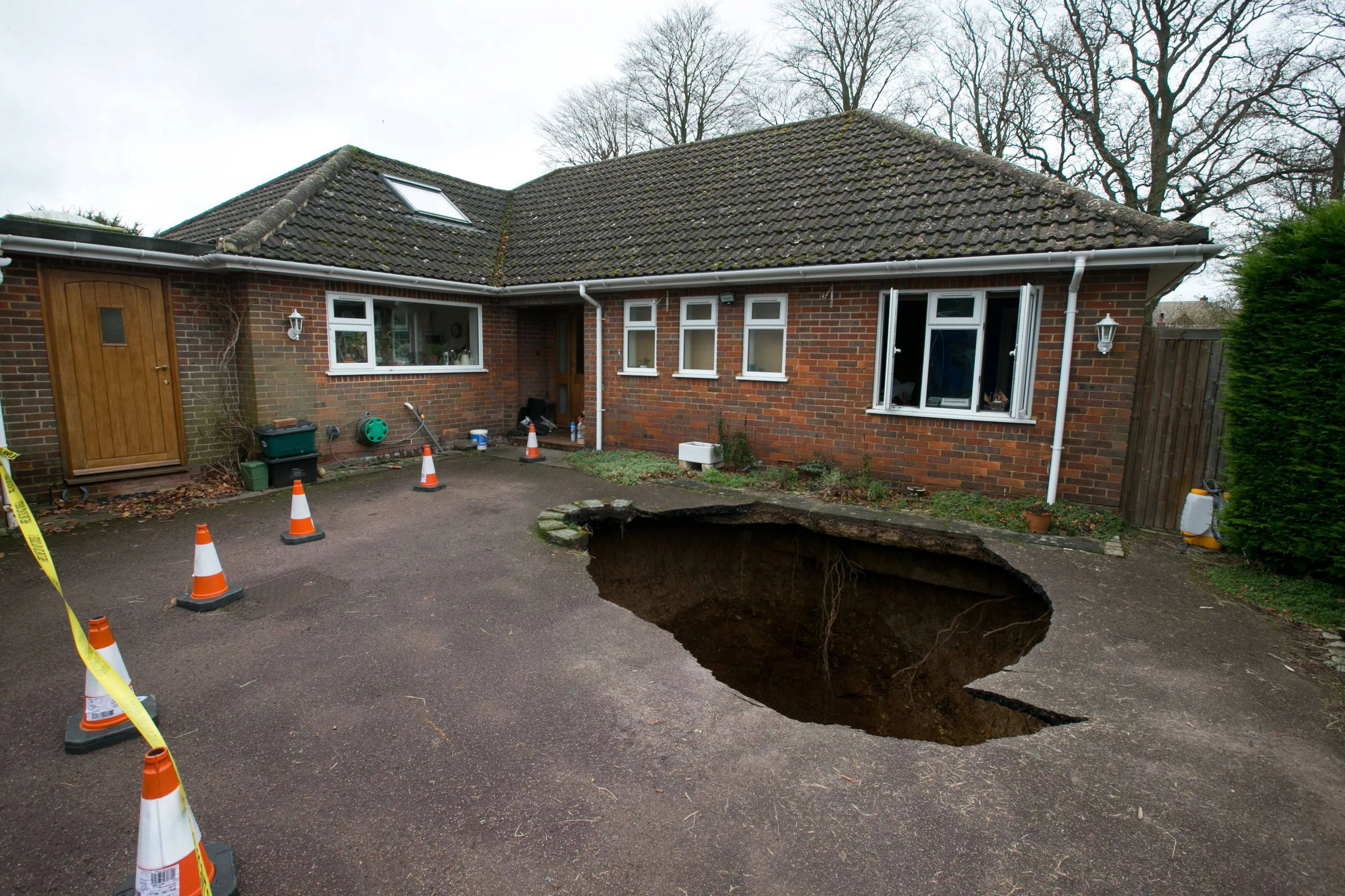 A view of the home of Phil and Liz Conran, in Main Road, Walter's Ash, High Wycombe, Buckinghamshire, after a 30ft-deep sinkhole opened up in the driveway yesterday and swallowed their car, on February 3, 2014. (Photo by Steve Parsons/PA Wire)