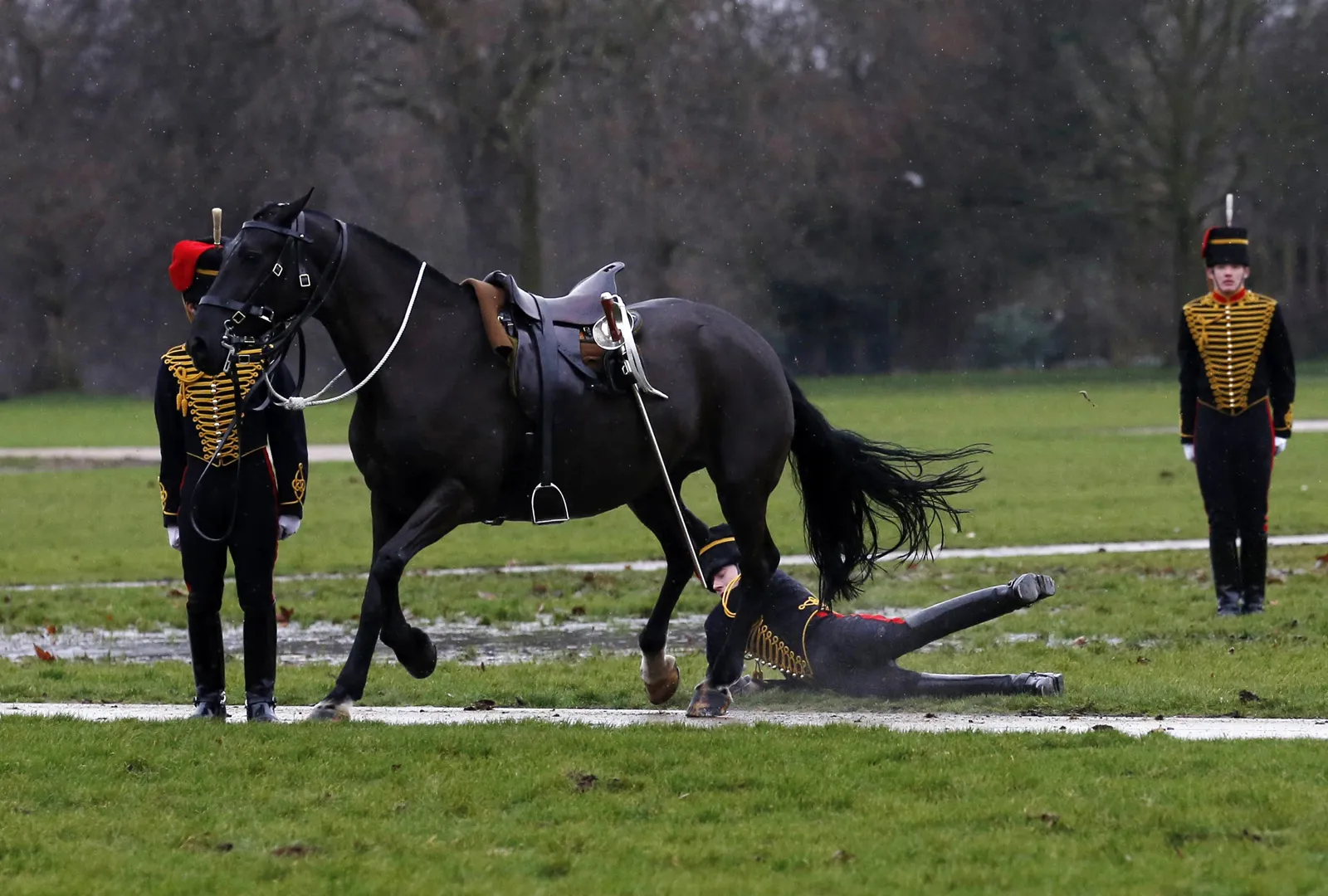 A rider falls off a horse during the King's Troop Royal Horse Artillery 41 Royal gun salute to mark the accession of Britain's Queen Elizabeth to the throne in 1952, at Hyde Park in central London February 6, 2014. (Photo by Olivia Harris/Reuters)