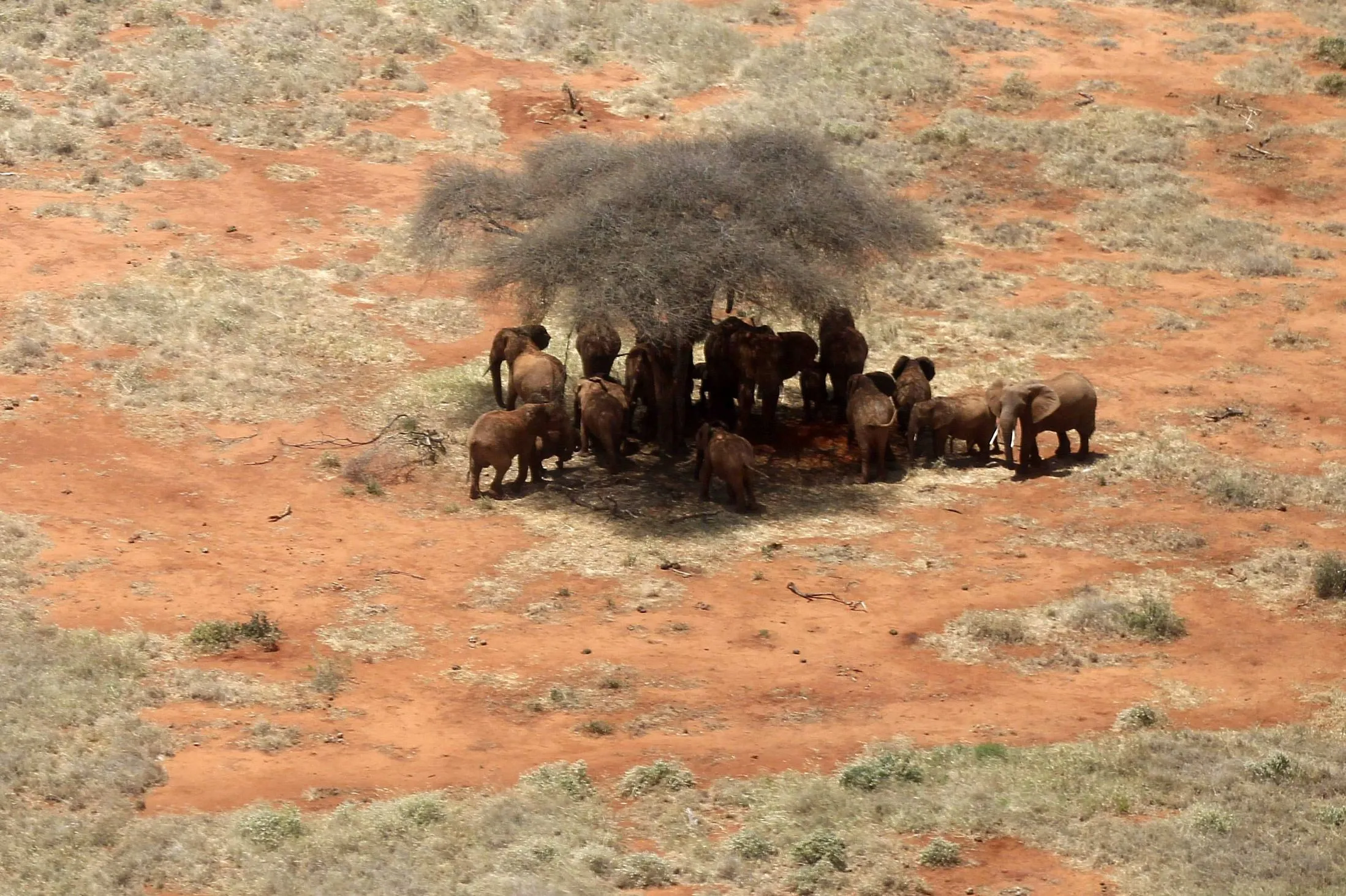 A family of elephants are seen under a tree during their aerial census at the Tsavo West national park within the Tsavo-Mkomazi ecosystem. (Photo by Thomas Mukoya/Reuters)