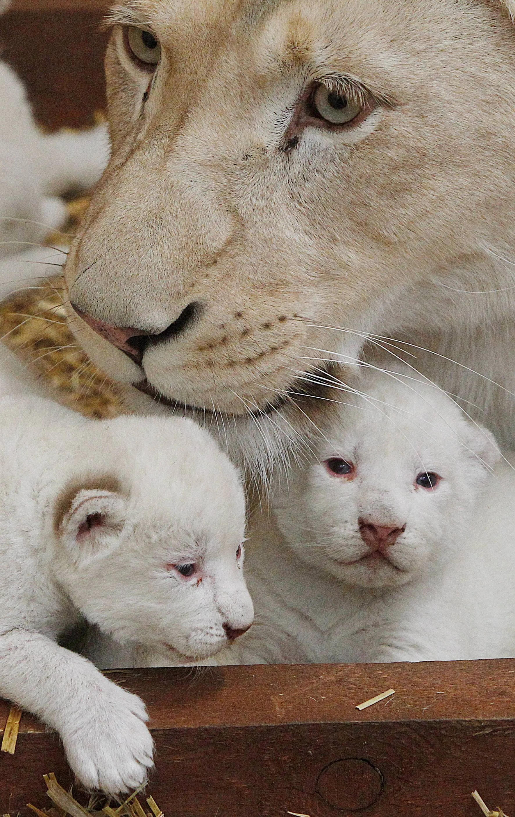 White lioness Azira lies in their cage with two of her three white cubs that were born last week in a private zoo in Borysew, in central Poland, on Tuesday, February 4, 2014. Zoo owner Andrzej Pabich says white lions often have defects the prevent giving birth, or the mother rejects her cubs, but two and a half-year-old Azira has been patiently feeding and caring for her little ones, as three and a half-year-old Sahim, who fathered them, watches from a neighboring cage. (Photo by Czarek Sokolowski/AP Photo)