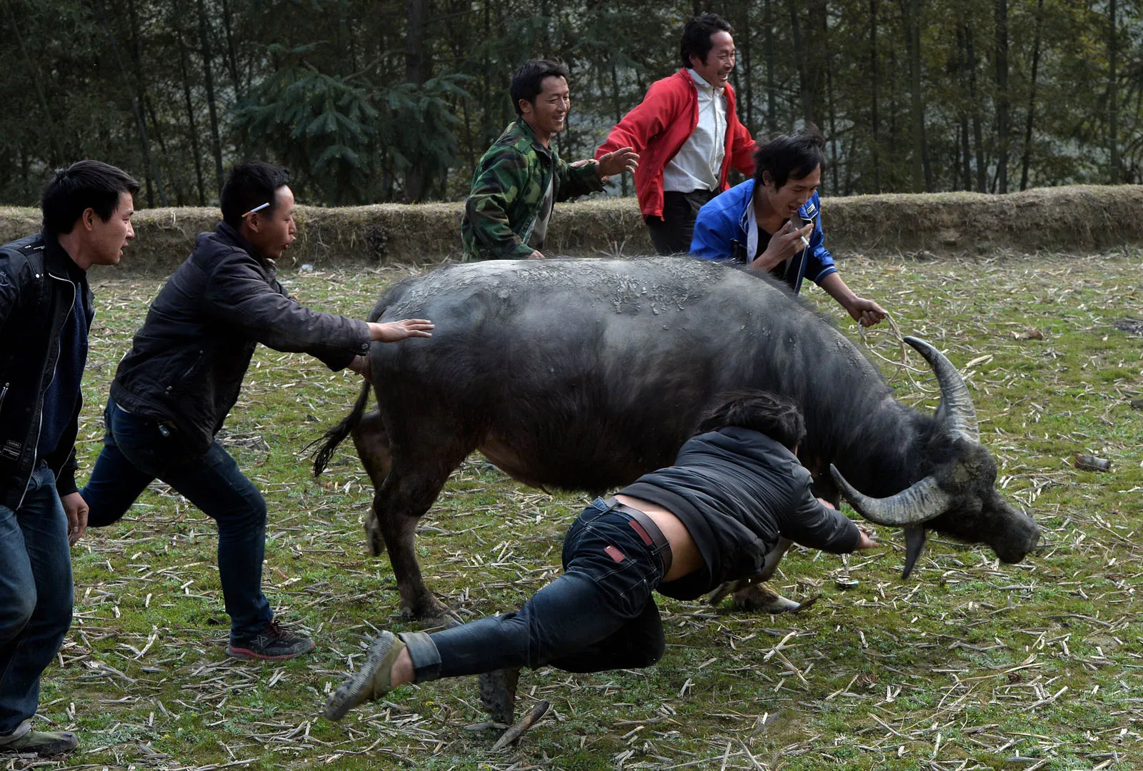 This photo taken on February 4, 2014 shows villagers trying to stop a buffalo fleeing during a traditional Chinese New Year buffalo fighting competition at the Miao Minority village of Biasha in Guizhou Province. The fights which date back to the 15th century see rival Miao minority villages competing against each other for the honor of champion buffalo. (Photo by Mark Ralston/AFP Photo)