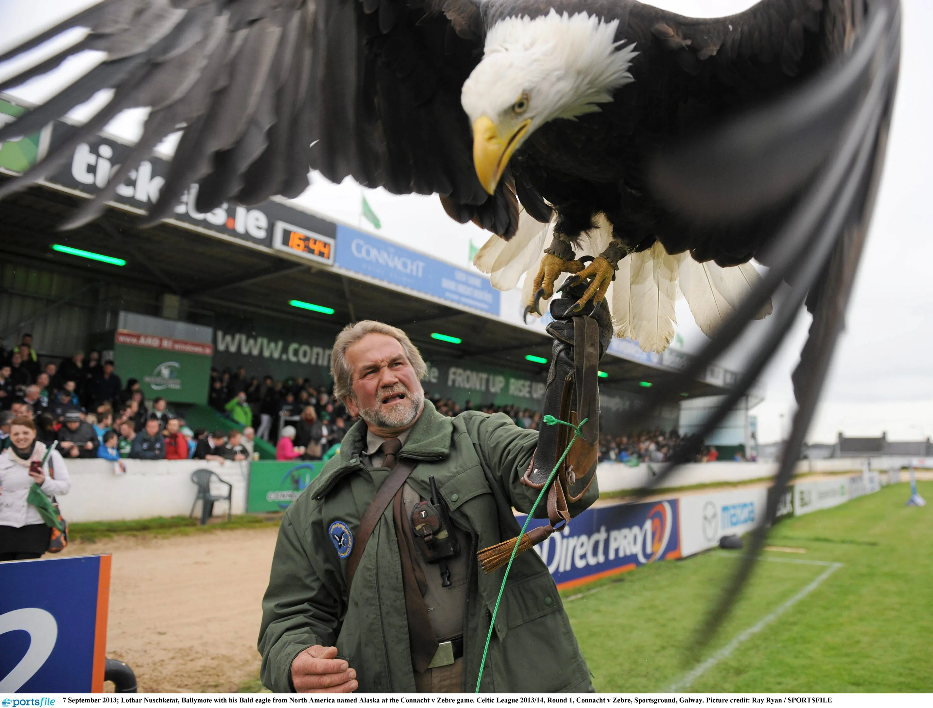 7 September 2013; Lothar Nuschketat, Ballymote with his Bald eagle from North America named Alaska at the Connacht v Zebre game. Celtic League 2013/14, Round 1, Connacht v Zebre, Sportsground, Galway. (Photo by Ray Ryan/SportsFile)