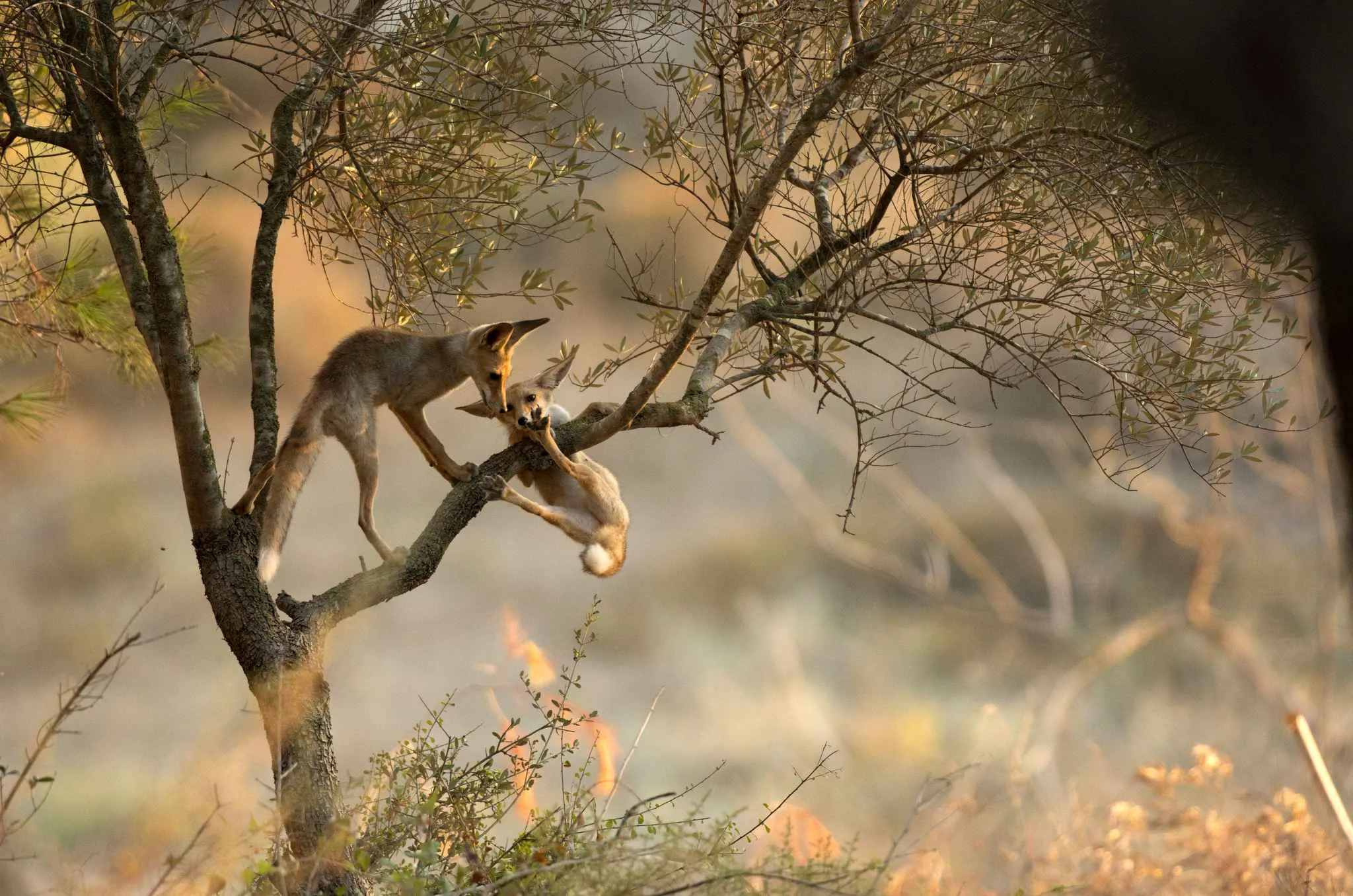 This fox seems to be doing a pull-up in a tree as it clings tightly to a branch. The fox struggles to hold its own body weight as it tries to pull itself up onto the branch. After attempting to pull itself up to safety, the animal is resigned to defeat and falls 4ft onto the ground. Software engineer Alex Geifman from Lod, Israel, travelled to the Ben Shemen Forest near Gimzo in his home country to take photographs of the foxes in the tree. (Photo by Alex Geifman/Solent News/SIPA Press)