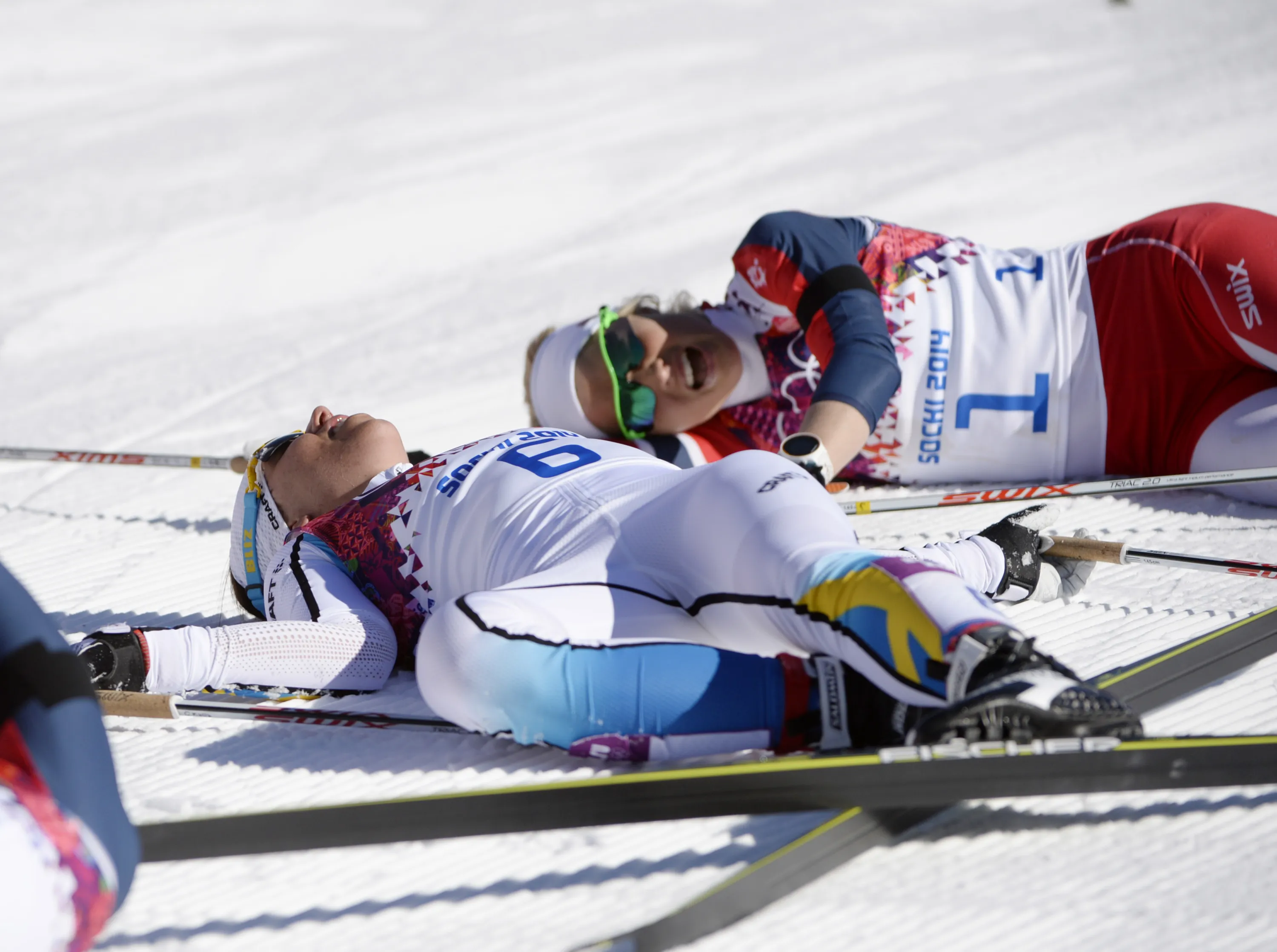 February 8, 2014; Krasnaya Polyana, Russia; Charlotte Kalla (SWE) and Therese Johaug (NOR) react at the finish line during the Sochi 2014 Olympic Winter Games at Laura Cross-Country Ski and Biathlon Center. (Photo by Eric Bolte/USA Today Sports)