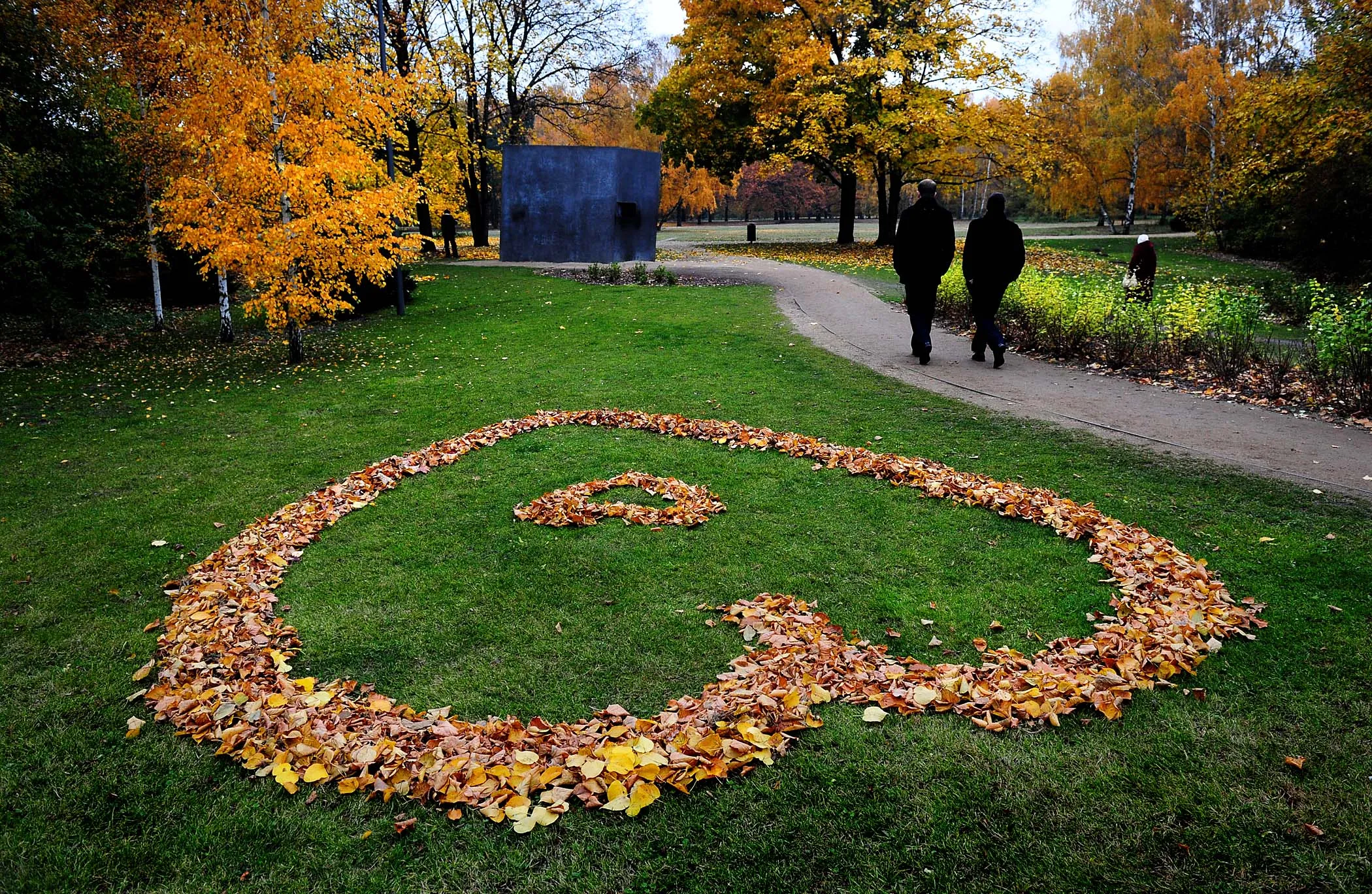 People walk past a heart made of autumnally colored leaves on the grass in Berlin's Tiergarten park. (Photo by Johannes Eisele/AFP Photo)