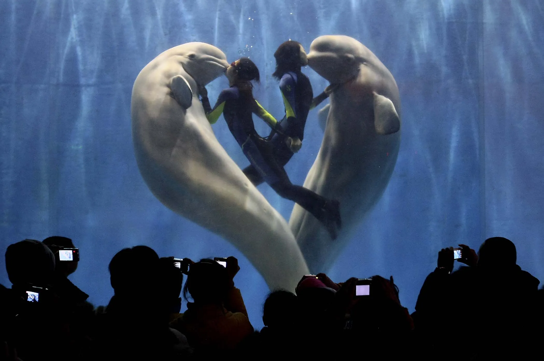 Two trainers and two beluga whales form a heart during their performance in an aquarium in Harbin, China. (Photo by Associated Press)