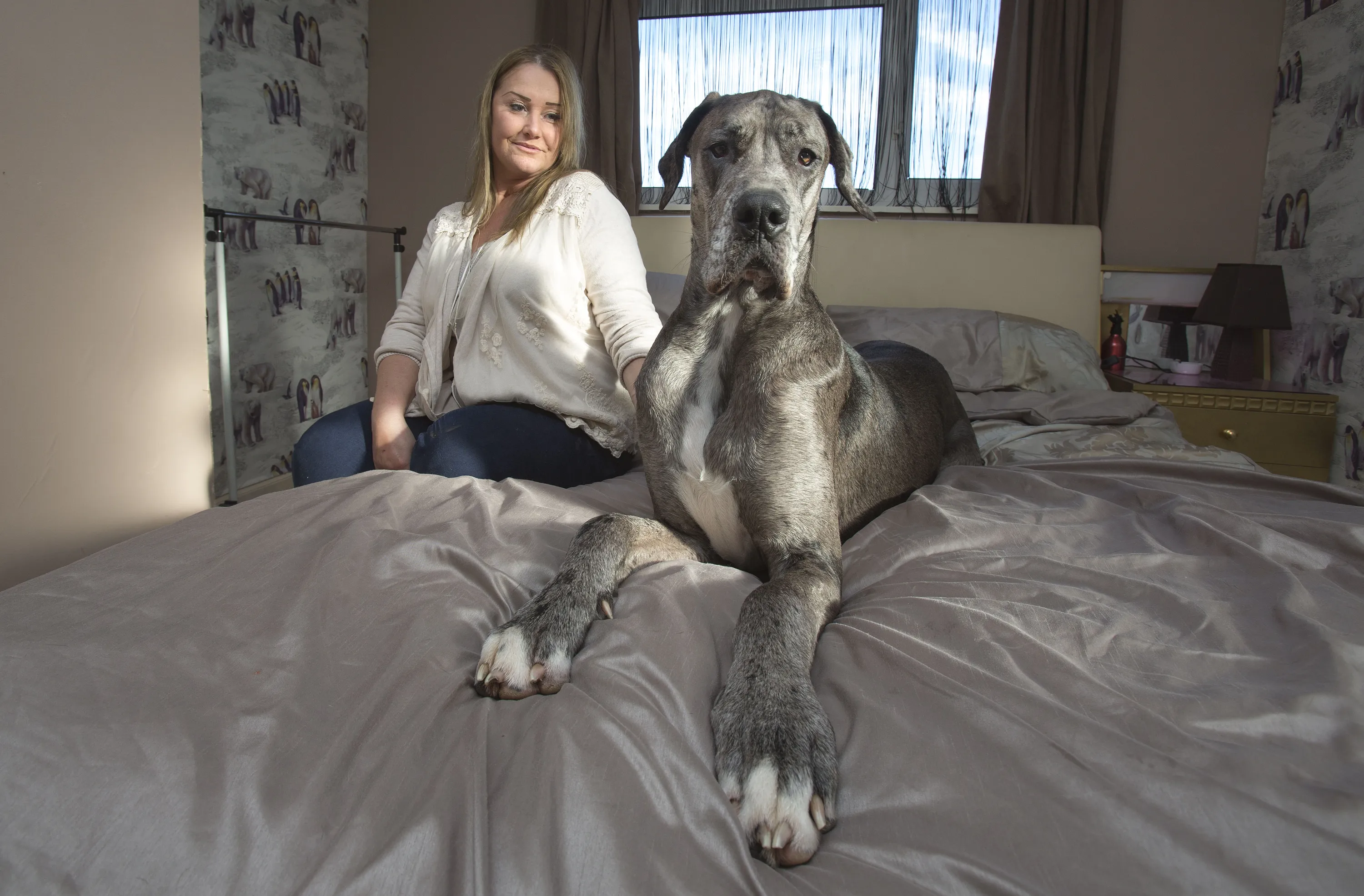 Britain's biggest dog, 18 month old great Dane, Freddy seen sitting on the bed as it's owner Claire Stoneman looks on in Southend-on-Sea, Essex, England. (Photo by Matt Writtle/Barcroft Media)