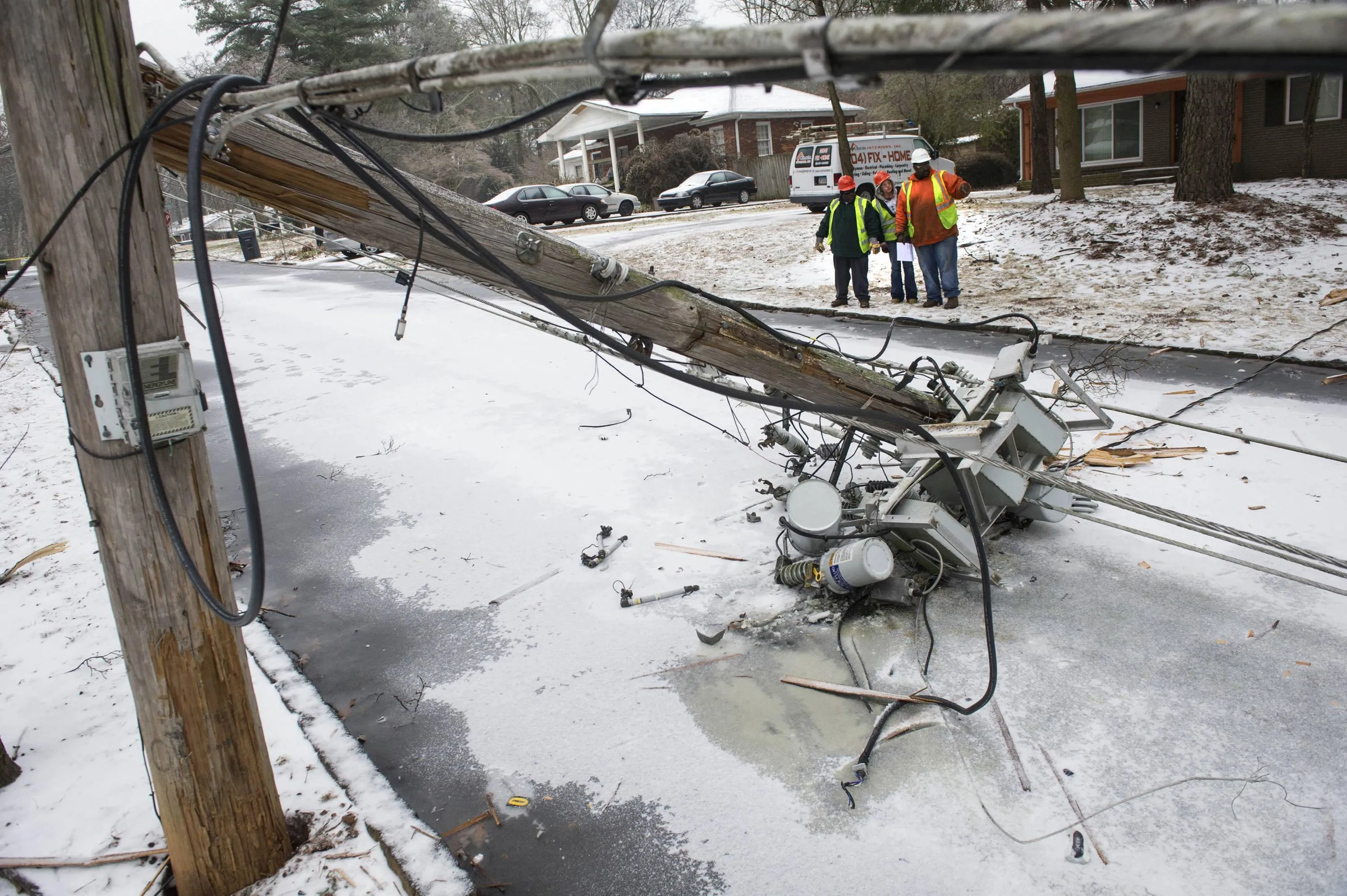 A crew asses the situation in front of a downed transformer smashed in the road during a winter storm on Wednesday, February 12, 2014, in Doraville, Ga. About 175,000 customers were without power Wednesday afternoon, power companies reported. (Photo by John Amis/AP Photo)