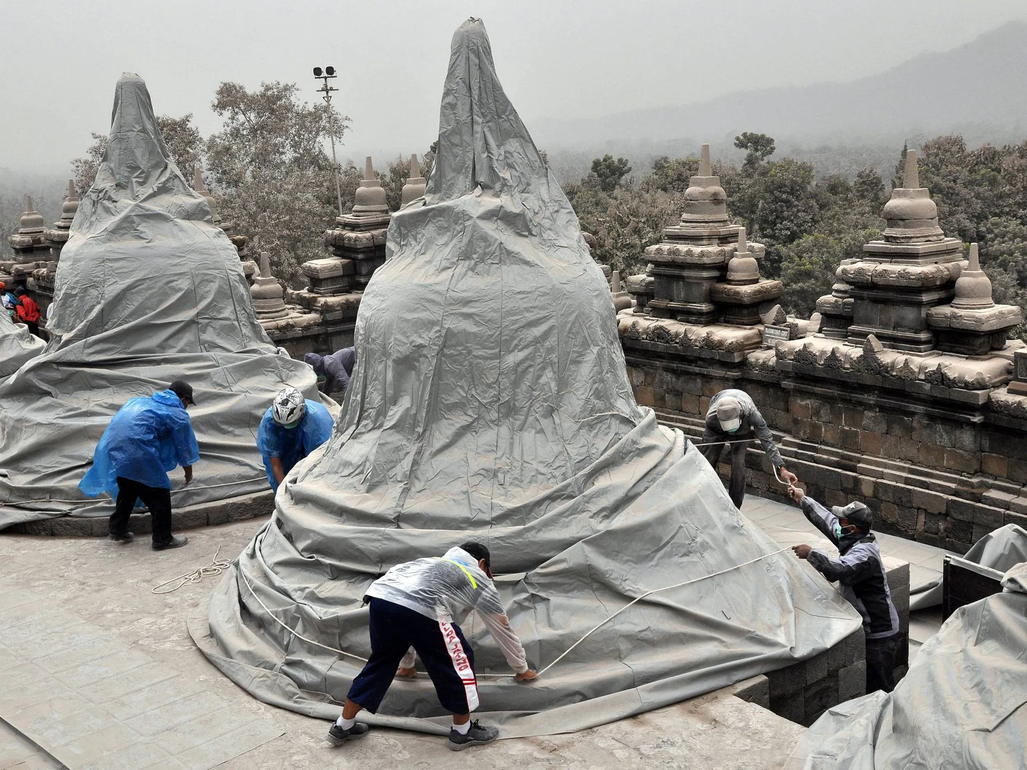 Indonesian workers cover the famous Borobudur temple to protect it from volcanic ash from the Mount Kelud volcano eruption in Magelang, Central Java. (Photo by EPA/Assabili)
