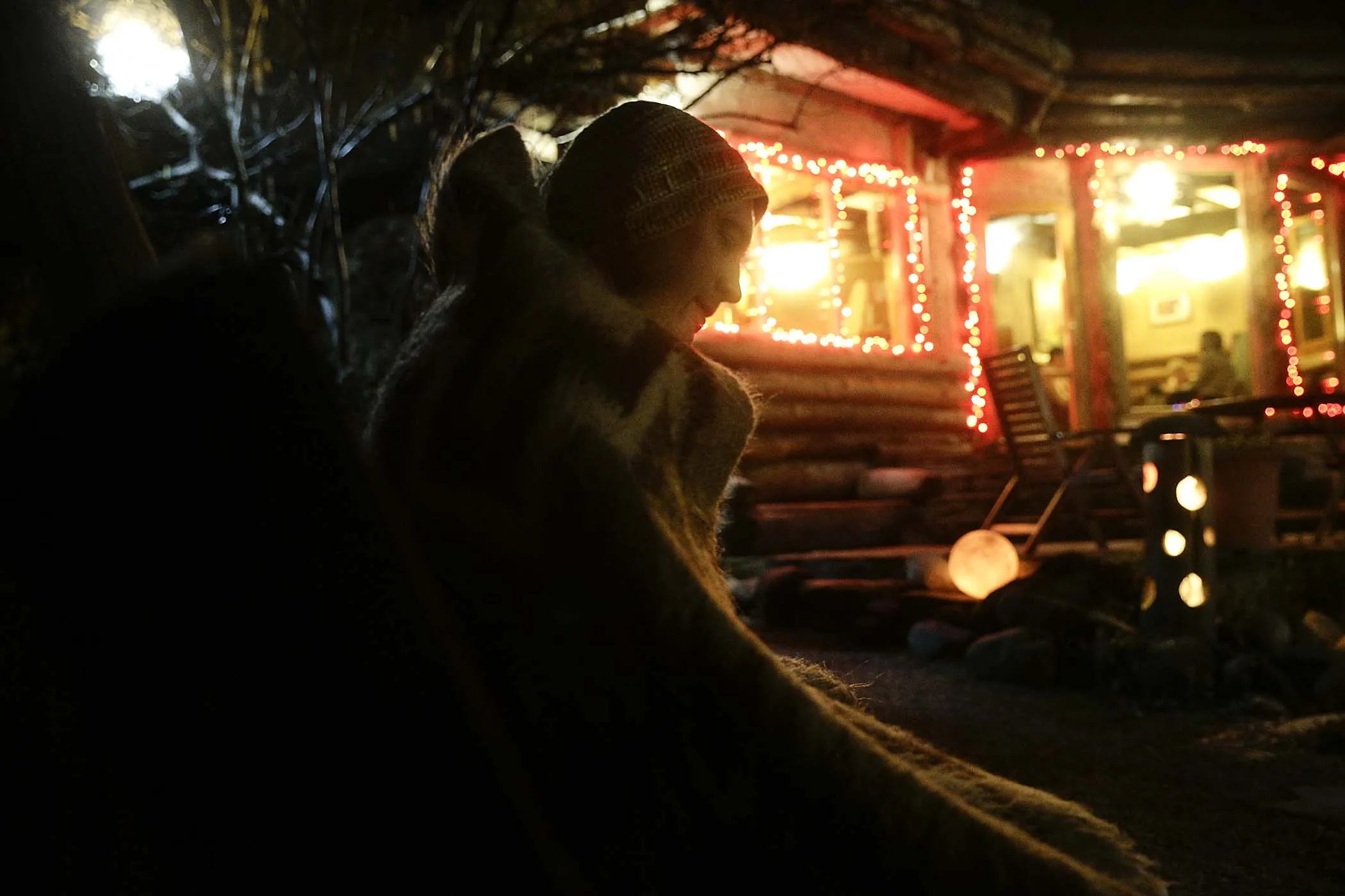 A guest sits on a bench in the outdoor sauna area. (Photo by Jae C. Hong/Associated Press)