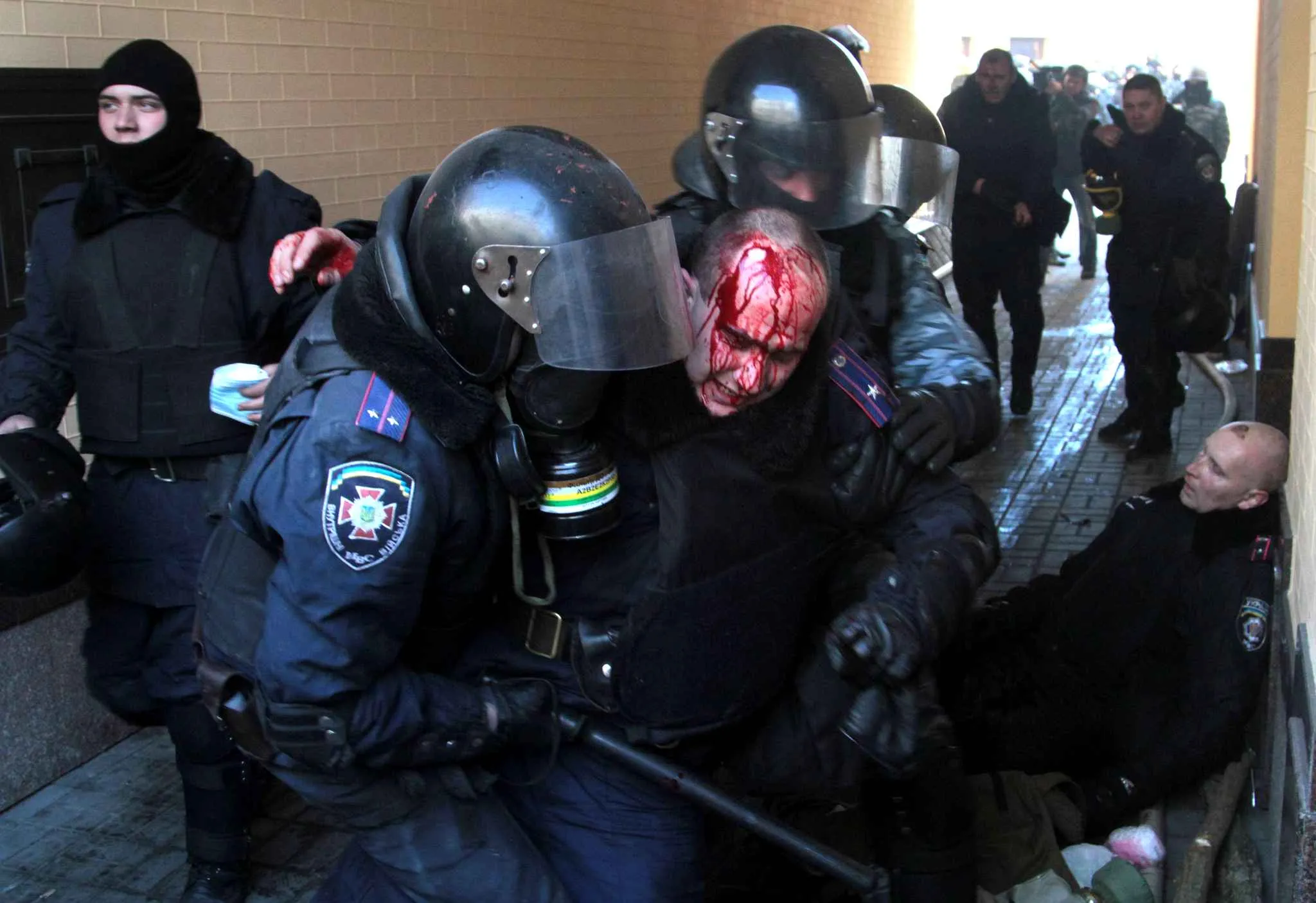 Policeman evacuate a wounded colleague during clashes with anti-government protesters in Kiev, on February 18, 2014. (Photo by Sergey Starostenko/Newscom/SIPA Press)
