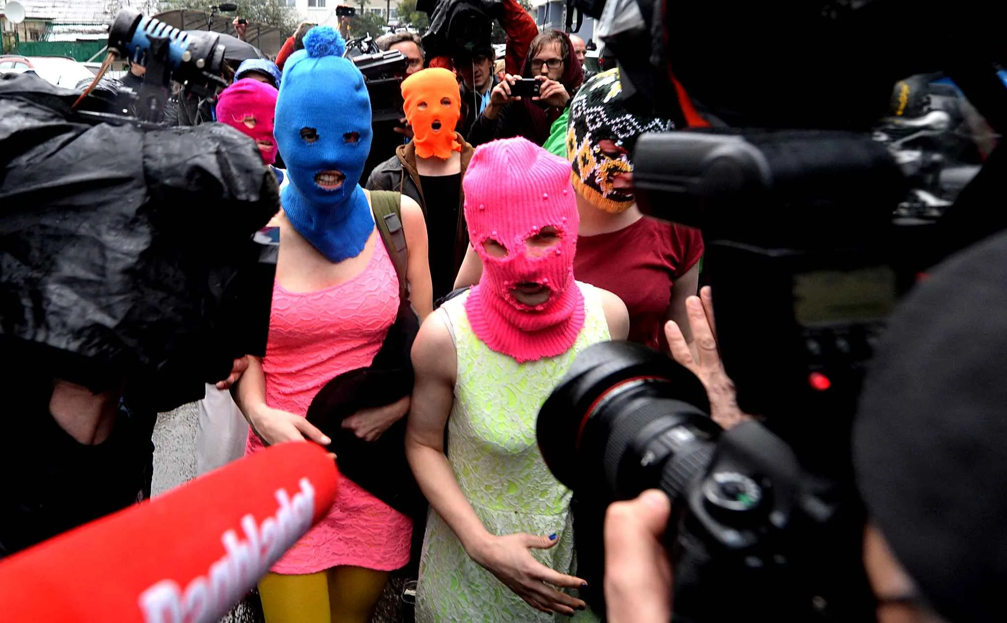 Wearing masks members of Russian punk group Pussy Riot, Nadezhda Tolokonnikova (L) and Maria Alyokhina (R) speak to journalists while leaving the police station of Adler, near Sochi, on February 18, 2014 after her arrest earlier in the host city of the 2014 Winter Olympics. Tolokonnikova and Maria Alyokhina walked free after being questioned about an alleged theft from a hotel. (Photo by Andrej Isakovic/AFP Photo)