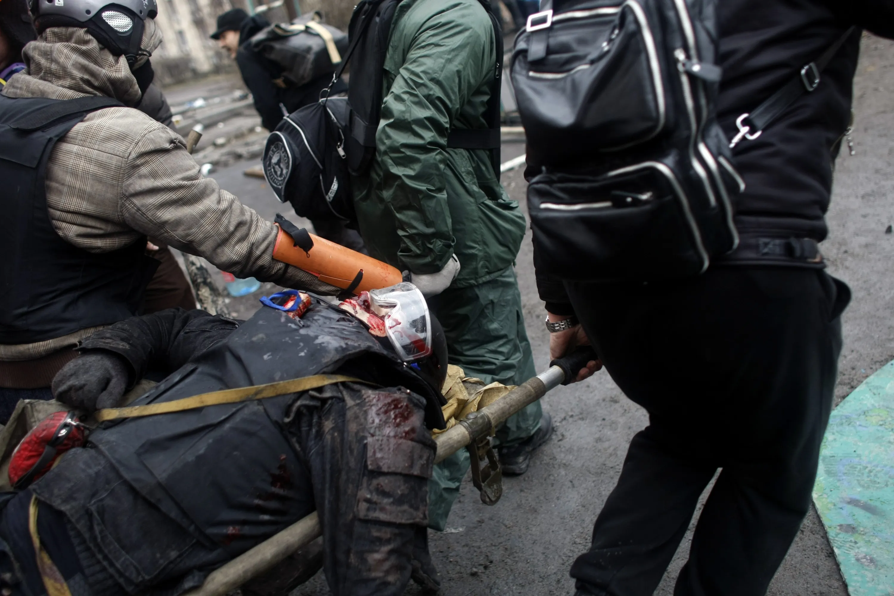 An anti-government protester who sustained a gun shot wound is being carried away to safety on the outskirts of Independence Square in Kiev, Ukraine, Thursday, February 20, 2014. (Photo by Marko Drobnjakovic/AP Photo)