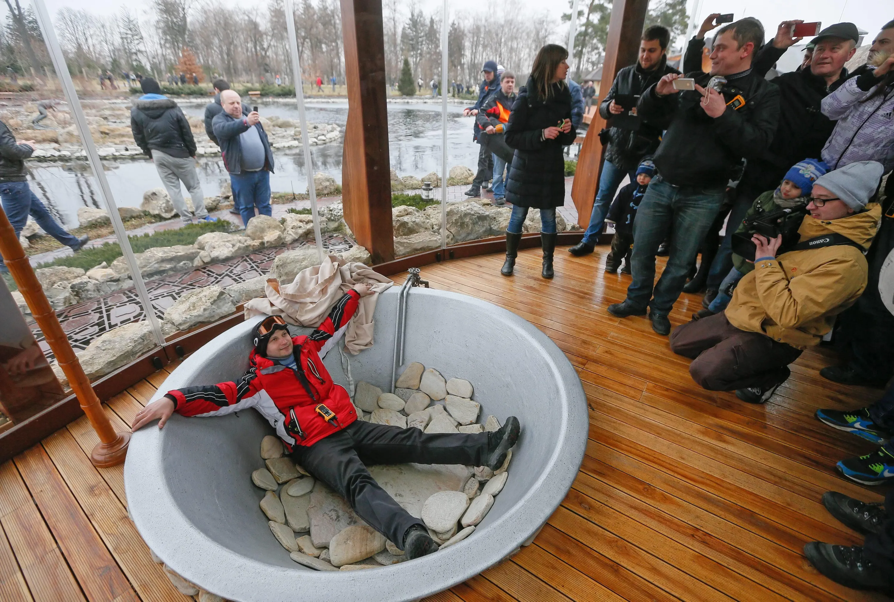 A man posed in a bathtub at the residence in Mezhyhirya village, near Kiev, on February 22, 2014. (Photo by Sergey Dolzhenko/EPA)