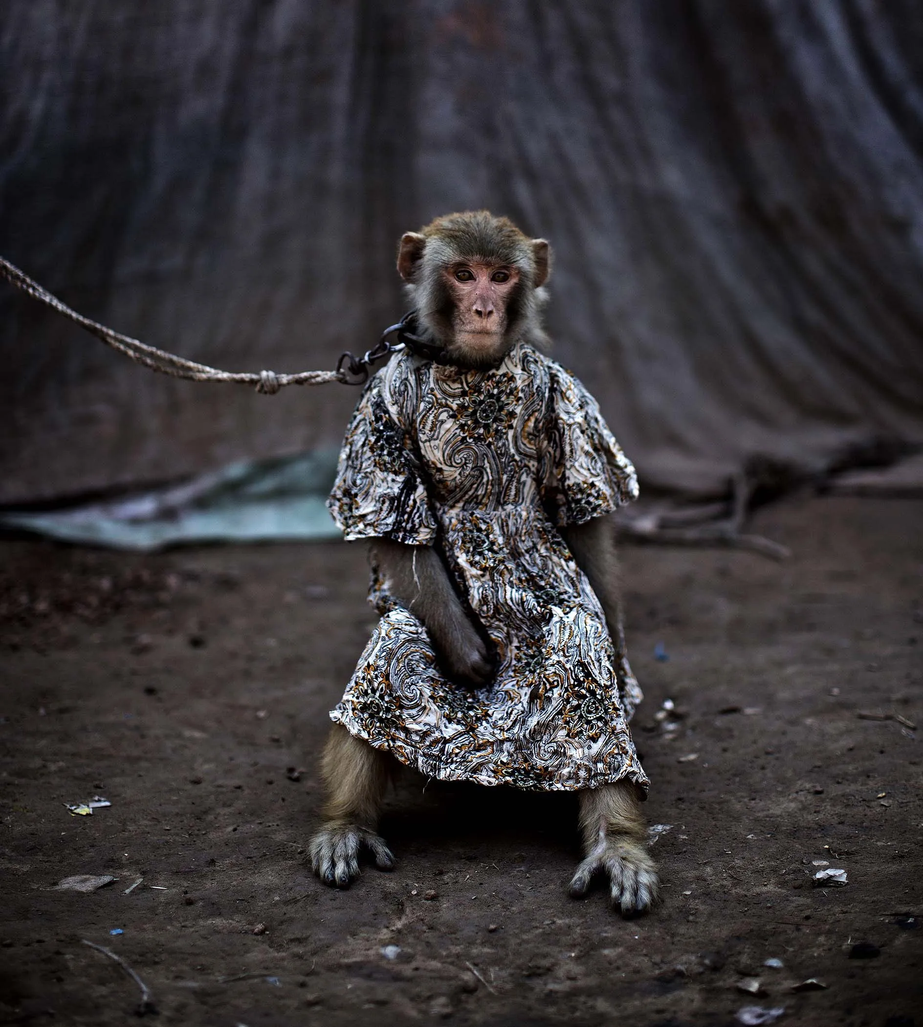 In this Tuesday, February 11, 2014, photo, a trained monkey, that makes a living for her Pakistani owner by performing to a crowd in public and private places, sits held by a leash, in Rawalpindi, Pakistan. For Pakistanis who raise and train the monkeys they are an important source of income in an impoverished country, and they form a strong bond with the animals. The monkeys are usually captured in the wild when they are babies and then trained. A trained monkey can fetch 20,000 to 30,000 rupees ($190 to $285). (Photo by Muhammed Muheisen/Associated Press)