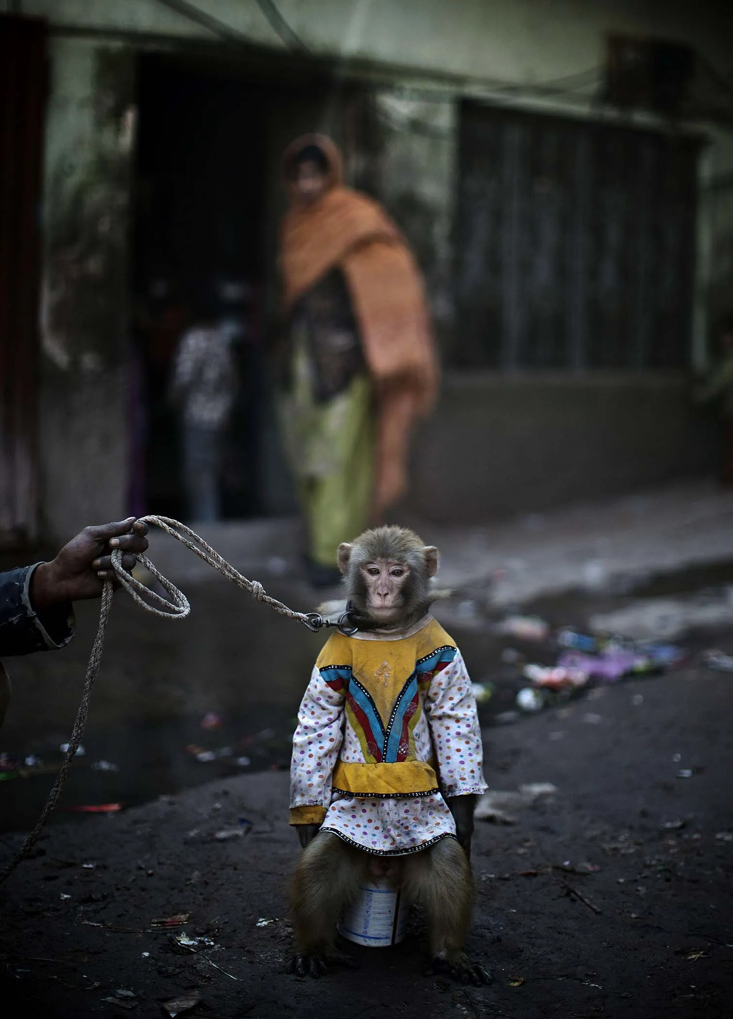 A trained monkey is held by a leash in Rawalpindi. (Photo by Muhammed Muheisen/Associated Press)