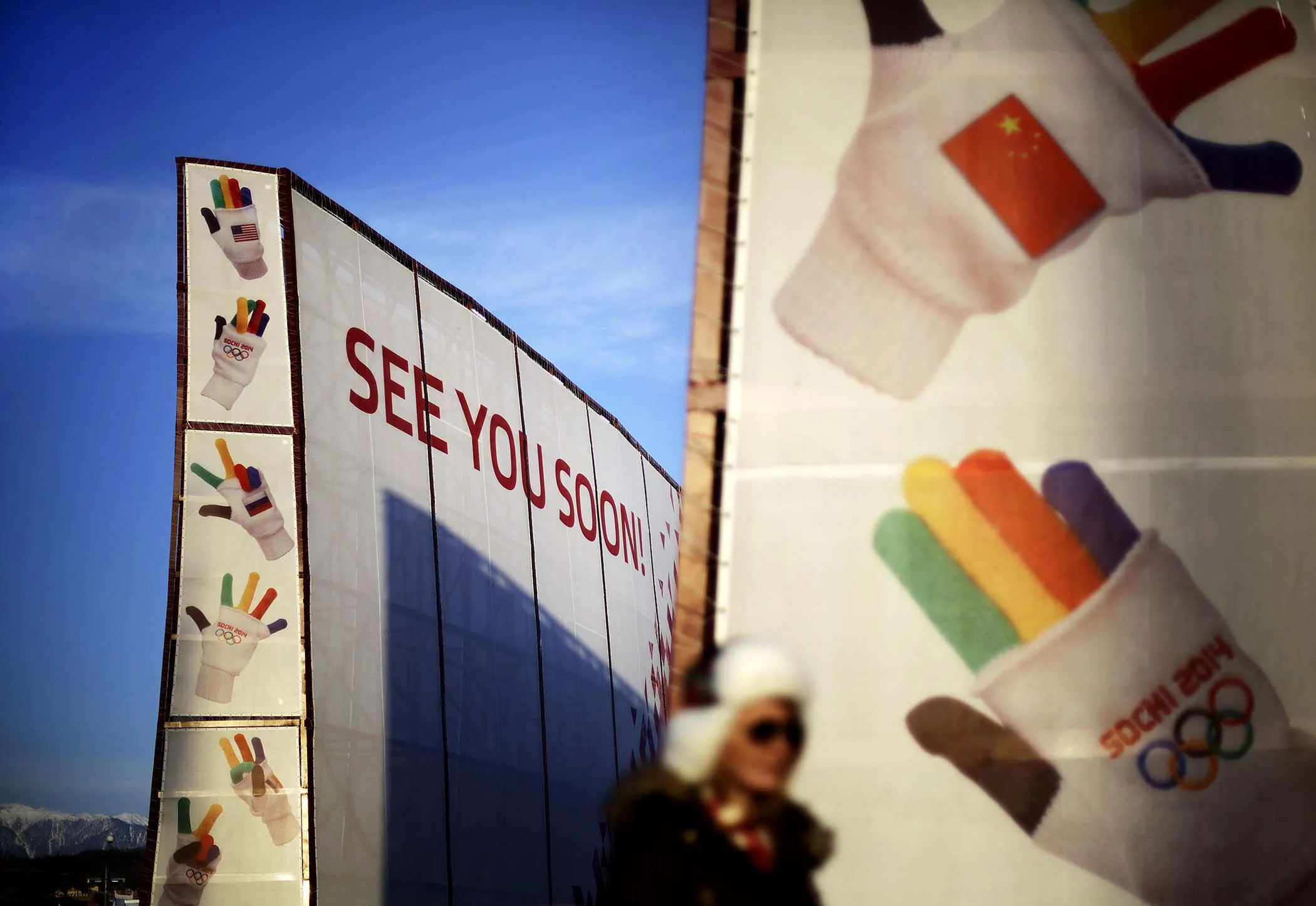 A spectator walks by a sign at the entrance to the Olympic Park ahead of the 2014 Winter Olympics closing ceremony in Sochi. (Photo by David Goldman/Associated Press)