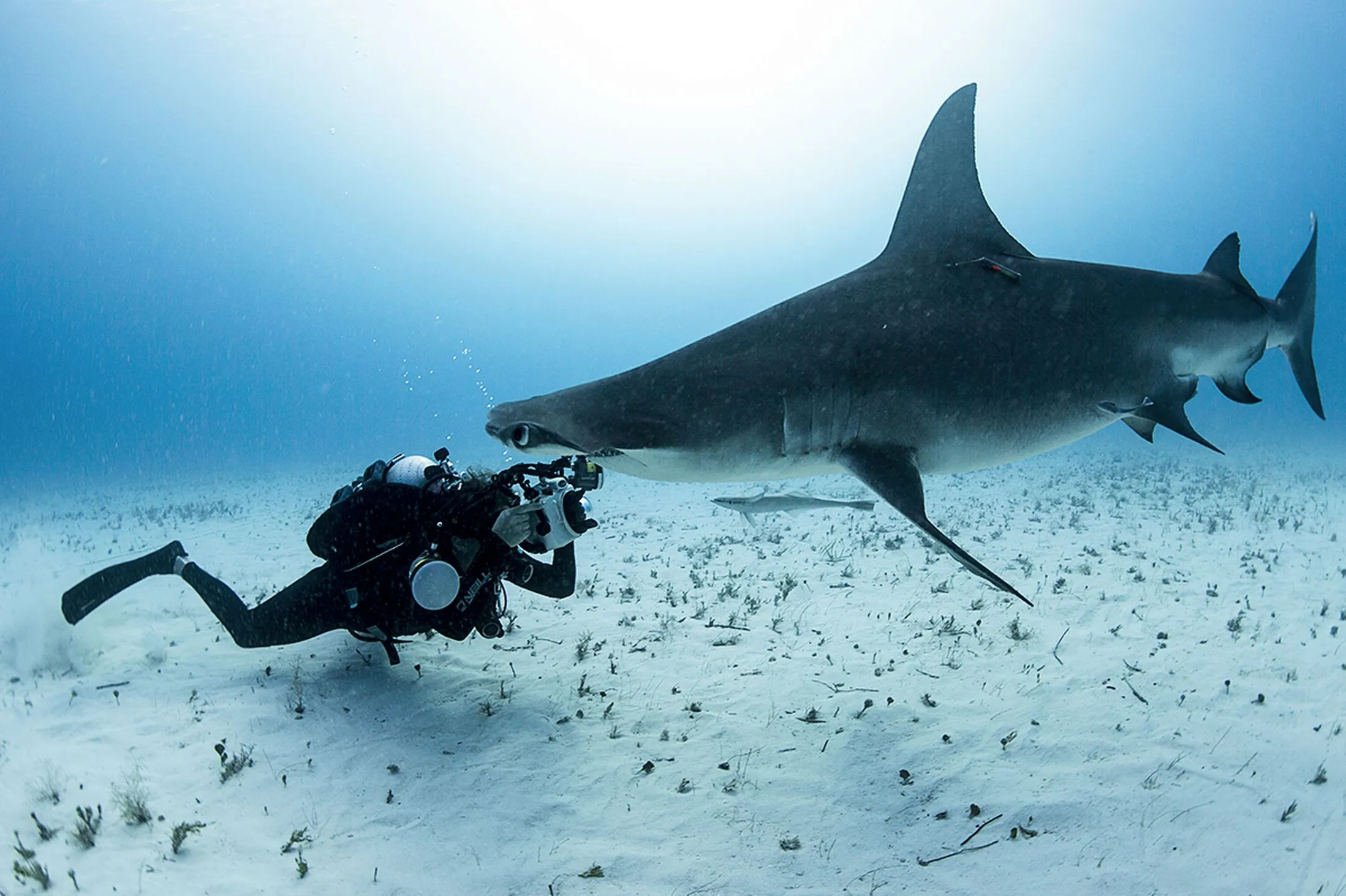 A diver films a hammerhead shark swimming close to the seabed near Bimini, Bahamas. (Photo by Amos Nachoun/Barcroft USA)