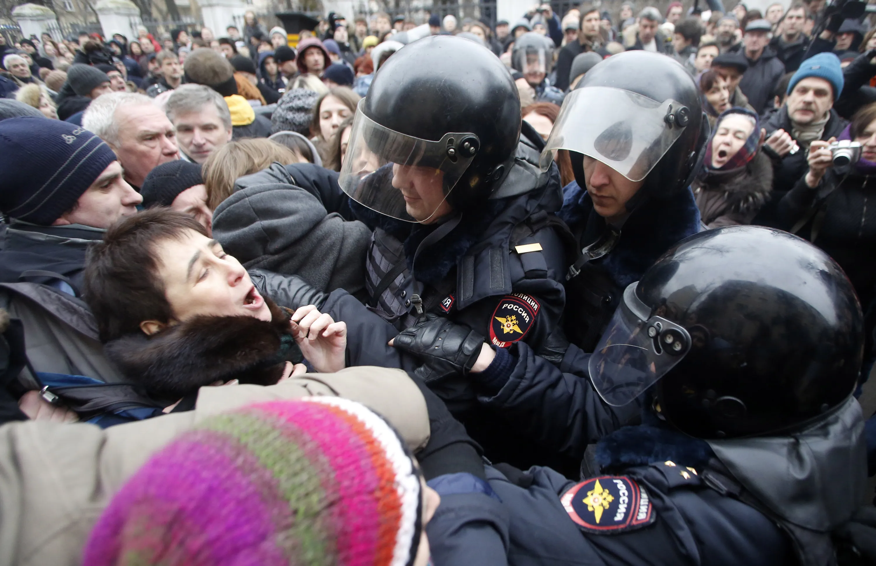 Russian police officers detain opposition activists outside a court room in Moscow, Russia, Monday, February 24, 2014, where hearings started against opposition activists detained on May 6, 2012 during a rally at Bolotnaya Square. (Photo by Denis Tyrin/AP Photo)