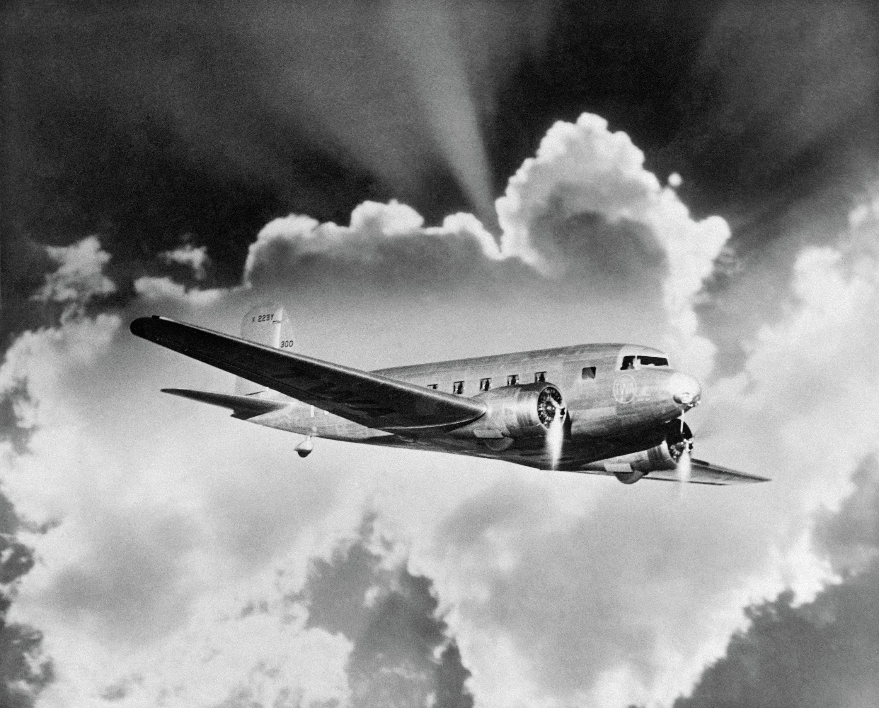Douglas DC-3 airliner. Advertising image prepared by Aerofilms for a client showing rays of sunshine from behind a cloud.The DC-3 entered civilian service with American Airlines in 1936. (Photo by Aerofilms Collection via “A History of Britain From Above”)