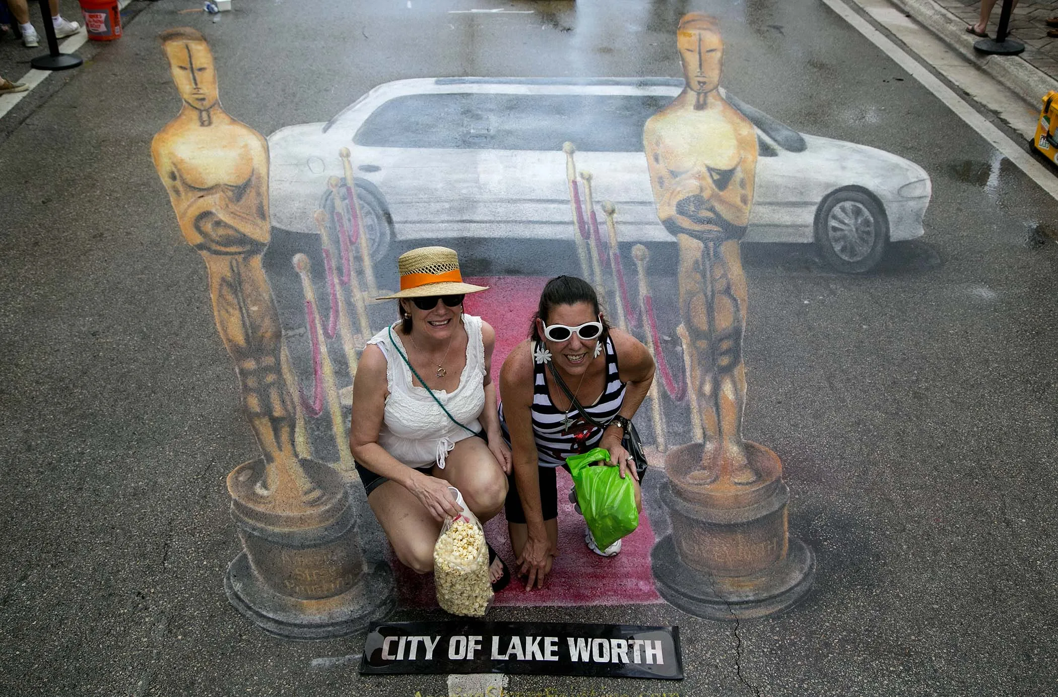 Gabrielle Mathews, of Lake Worth, and Martine Demler, of Boynton Beach, pose for photos on the red carpet of a rain soaked version of the the Academy Awards red carpet, created by artist Jennifer Chaparro. (Photo by Greg Lovett/The Palm Beach Post)