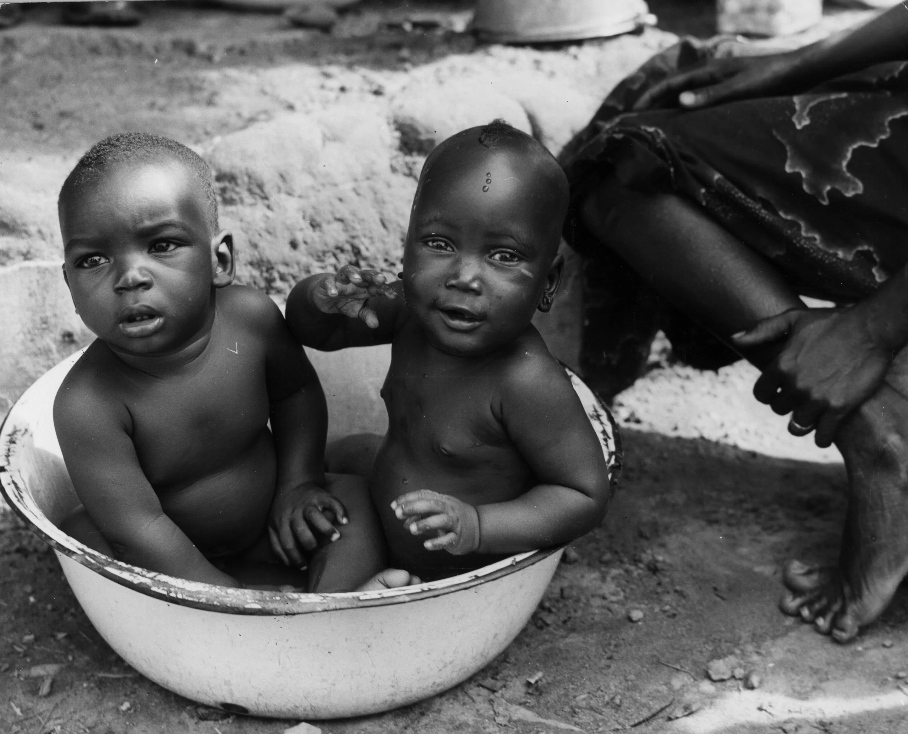 Two children from the west African Republic of Liberia take a bath in a large bowl, circa 1955. (Photo by Three Lions/Getty Images)
