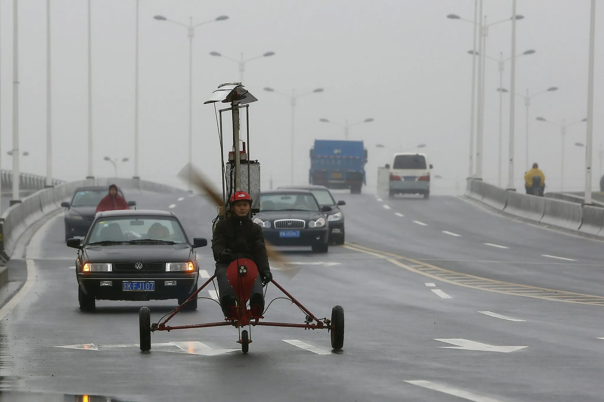 Luo Jinsha drives his self-made aircraft during a test flight on the outskirts of Shanghai, February 26, 2014. Luo, 28, a migrant worker living in Shanghai, spent around eight months and 40,000 yuan ($6,529) to build the plane to fulfil his dream to fly. Despite failing during the first test flight, Luo said he will not give up hope on improving his plane so as to eventually fly it successfully. The aircraft was able to move quickly on the ground but could not take to the air on second attempt. (Photo by Aly Song/Reuters)