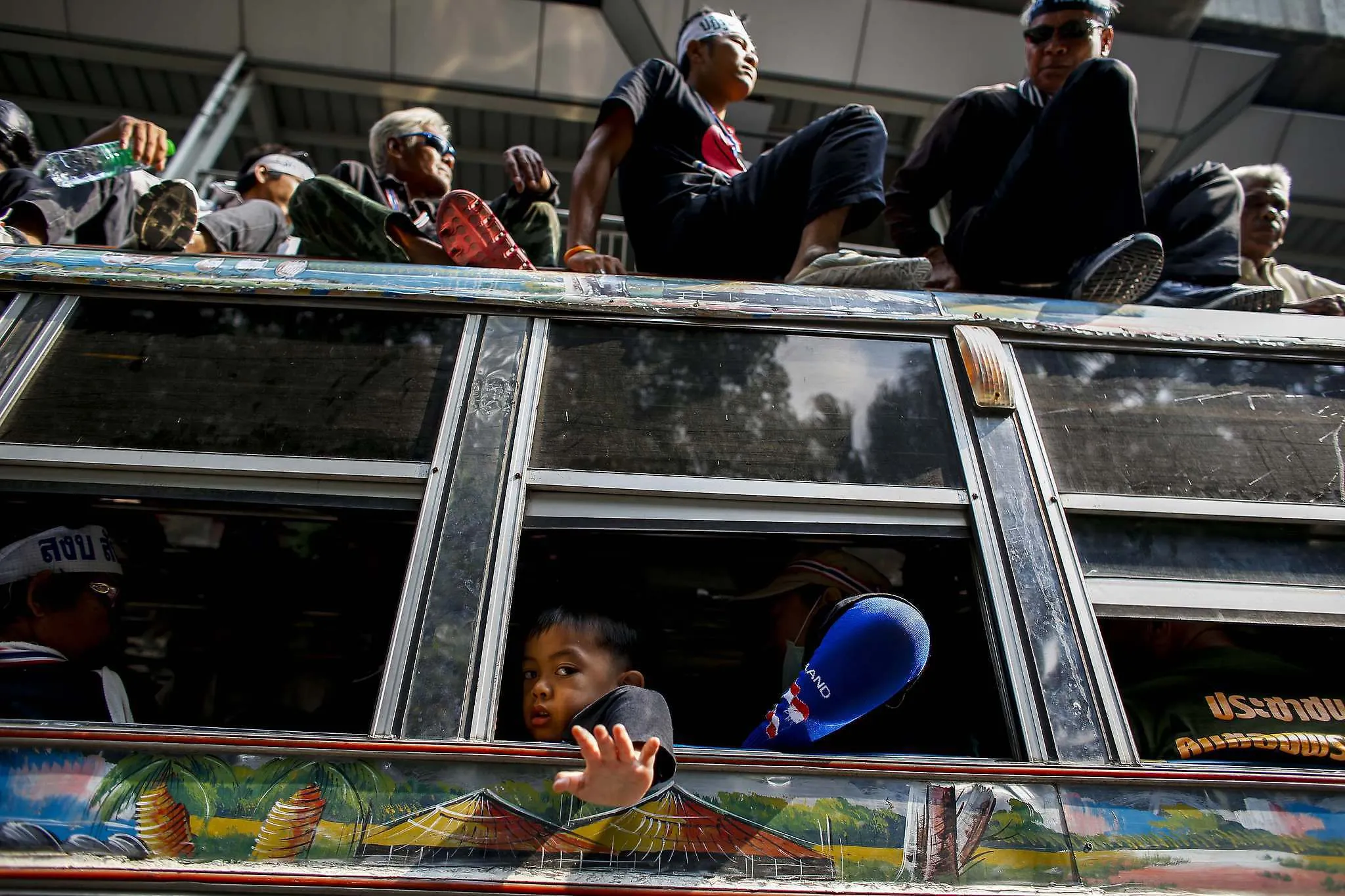 A child waves as he gathers with others during a rally outside the Royal Thai Police headquarters in central Bangkok February 26, 2014. Shots fired by unknown gunmen on Wednesday rattled parts of the Thai capital where anti-government protesters have set up camp for weeks, with small but occasionally deadly bombs and gunfire fast becoming the new norm in the city. (Photo by Athit Perawongmetha/Reuters)