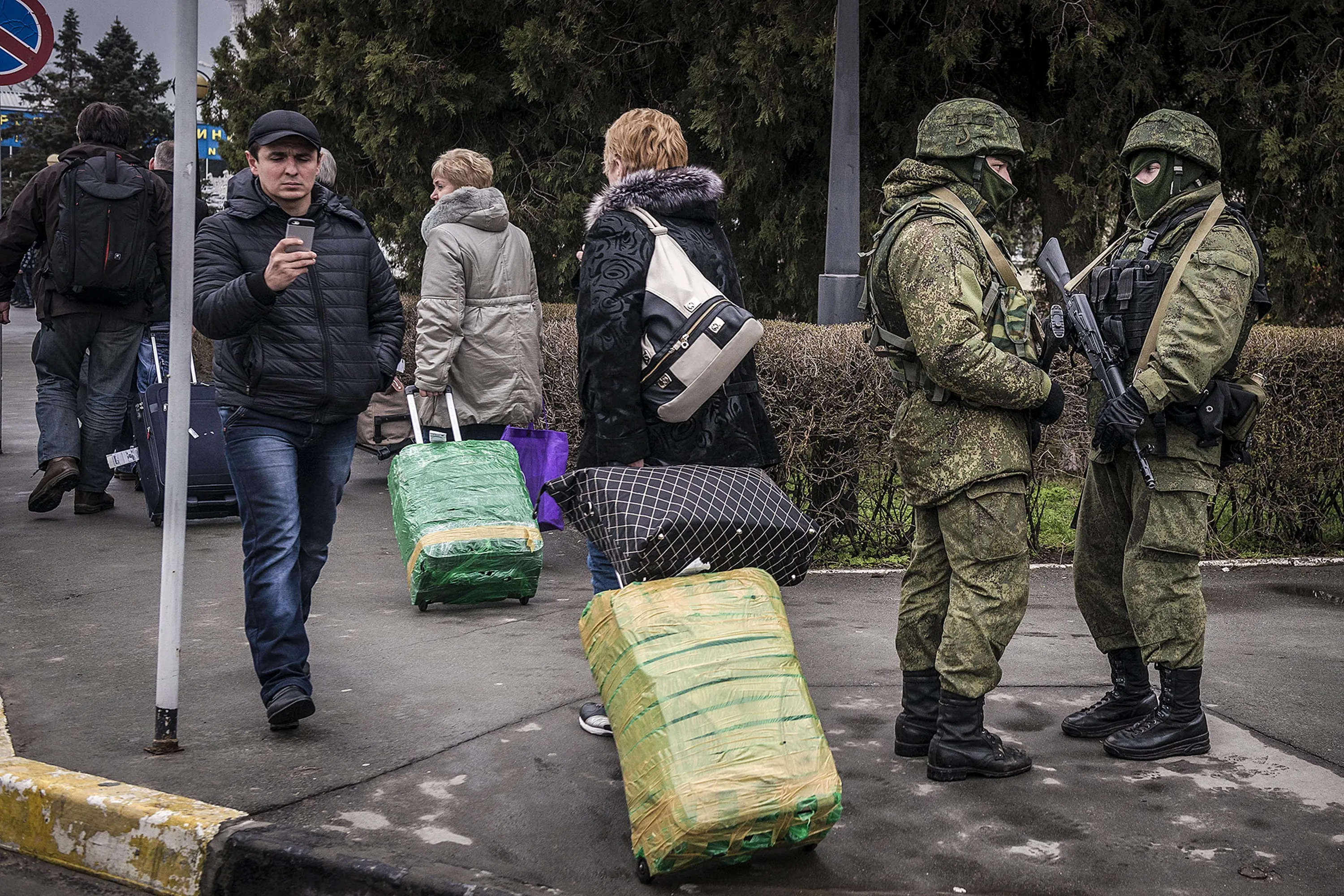 Armed men patrol the street outside Simferopol's airport in the Crimea region of Ukraine, on February 28, 2014. As the possibility of a showdown between Ukraine�s fledgling government and the Kremlin appeared to grow Friday, armed men whose uniforms bore no insignia took up positions at the Simferopol and Belbek airports as Interior Minister Arsen Avakov warned of a direct provocation, but there was no sign of any violence. (Photo by Sergey Ponomarev/The New York Times)
