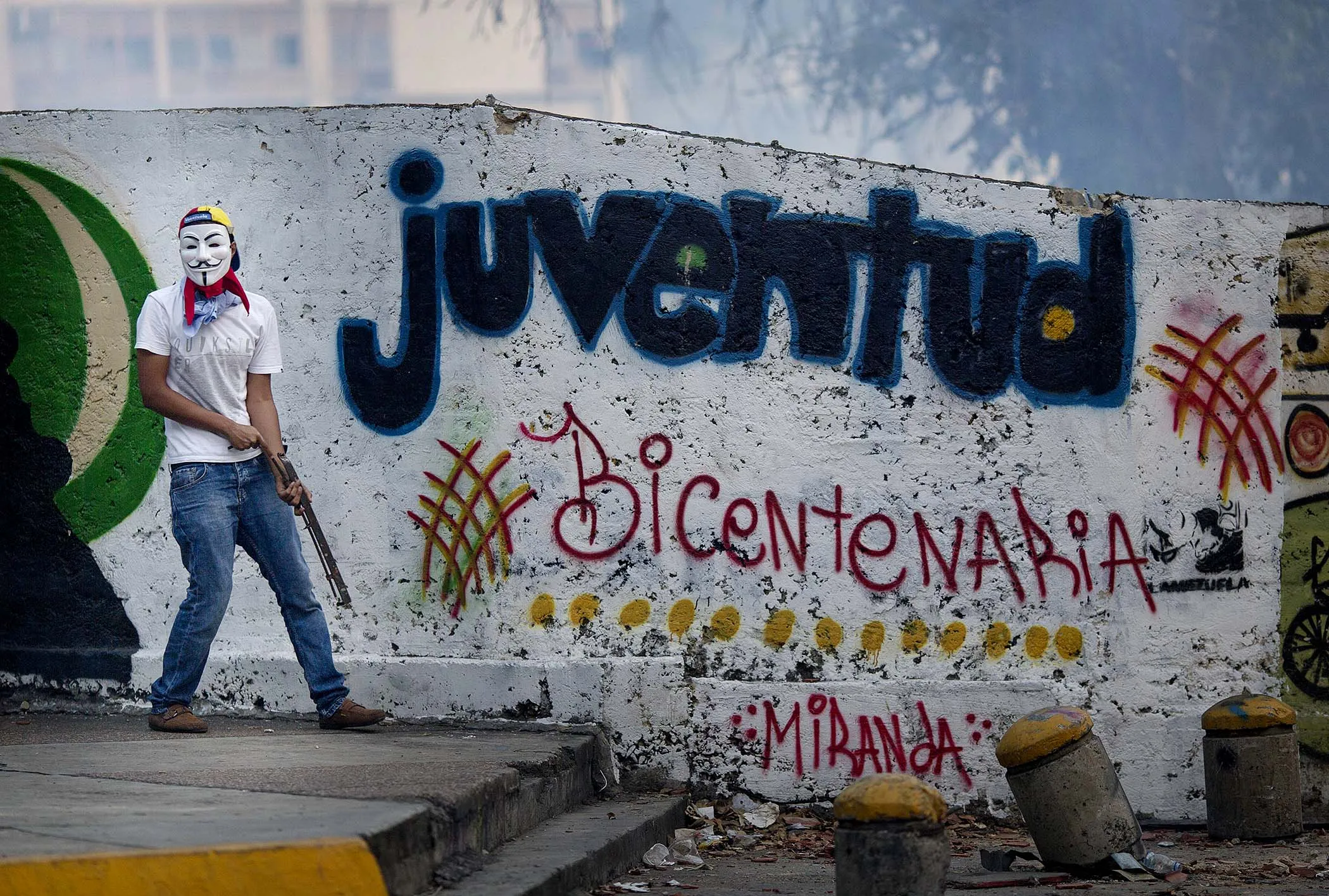 An anti-government protestor holds a piece of metal in Caracas, Venezuela, on February 22, 2014. After their opposition rally broke up in the late afternoon, in a pattern that has been seen in past demonstrations, about 1,000 stragglers erected barricades of trash and other debris and threw rocks and bottles at police and National Guardsmen. The troops responded with volleys of tear gas to prevent the students from reaching a highway and blocking traffic. (Photo by Rodrigo Abd/Associated Press)