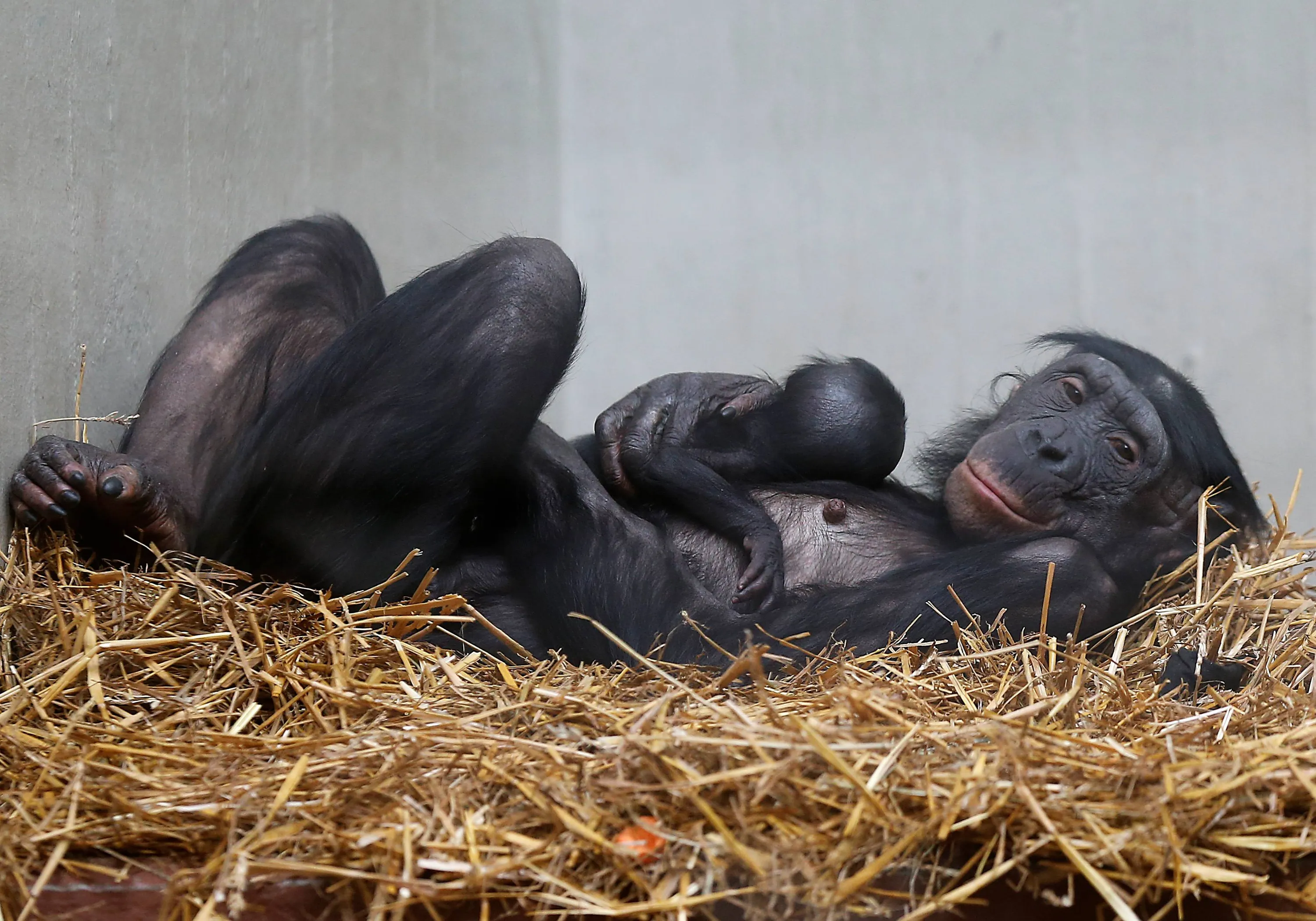 Bonobo monkey mother Muhdeblu comforts her newborn baby at the Zoo in Wuppertal, Germany, Wednesday, Feb. 26, 2014. The yet unnamed female baby was born on February 6, 2014 and supporters are asked to vote for a name. (Photo by Frank Augstein/AP Photo)