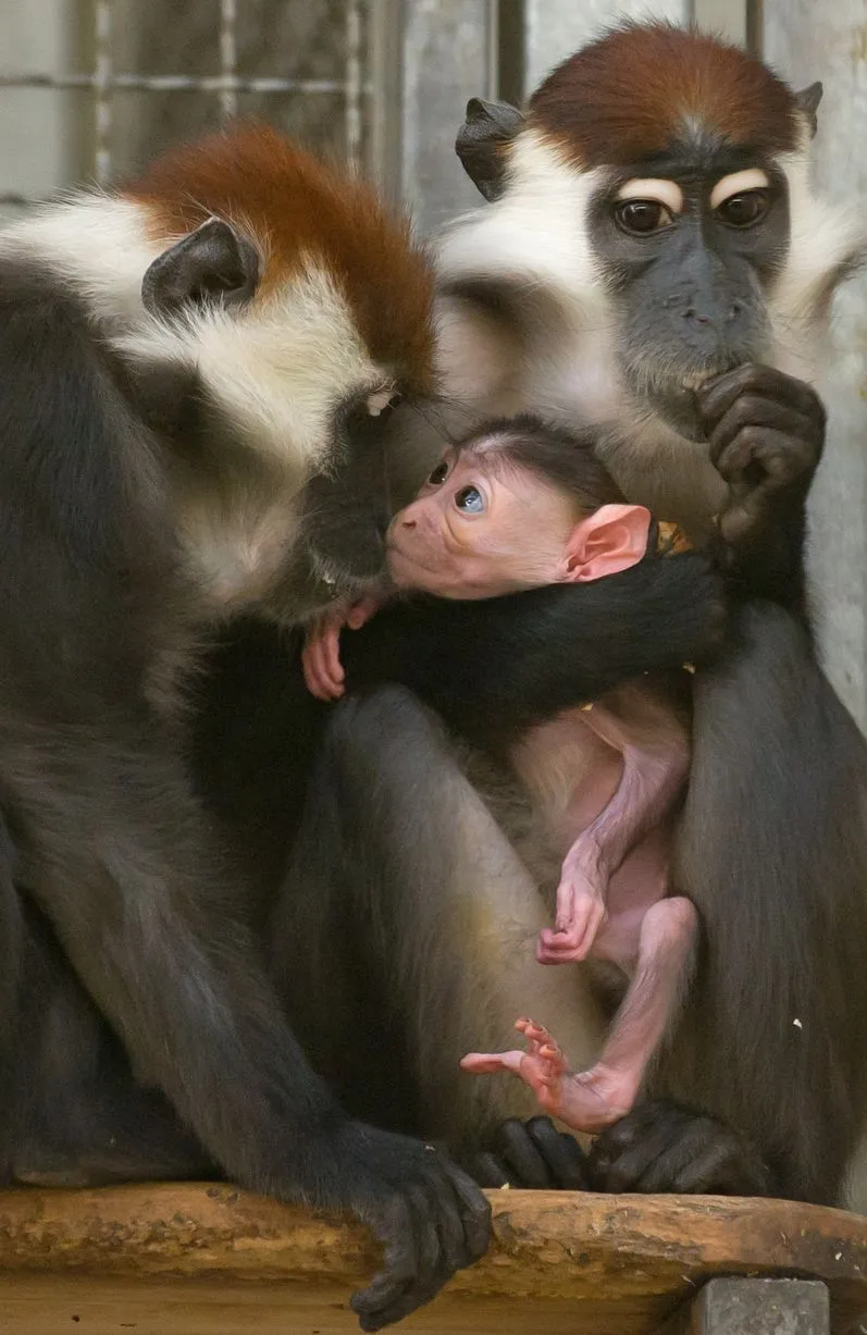 A collared mangabey monkey Sina (R) holds its offspring next to another female Gina on February 25, 2014 at the zoo in Berlin their offspring in her arms. (Photo by Tim Brakemeier/AFP Photo/DPA)