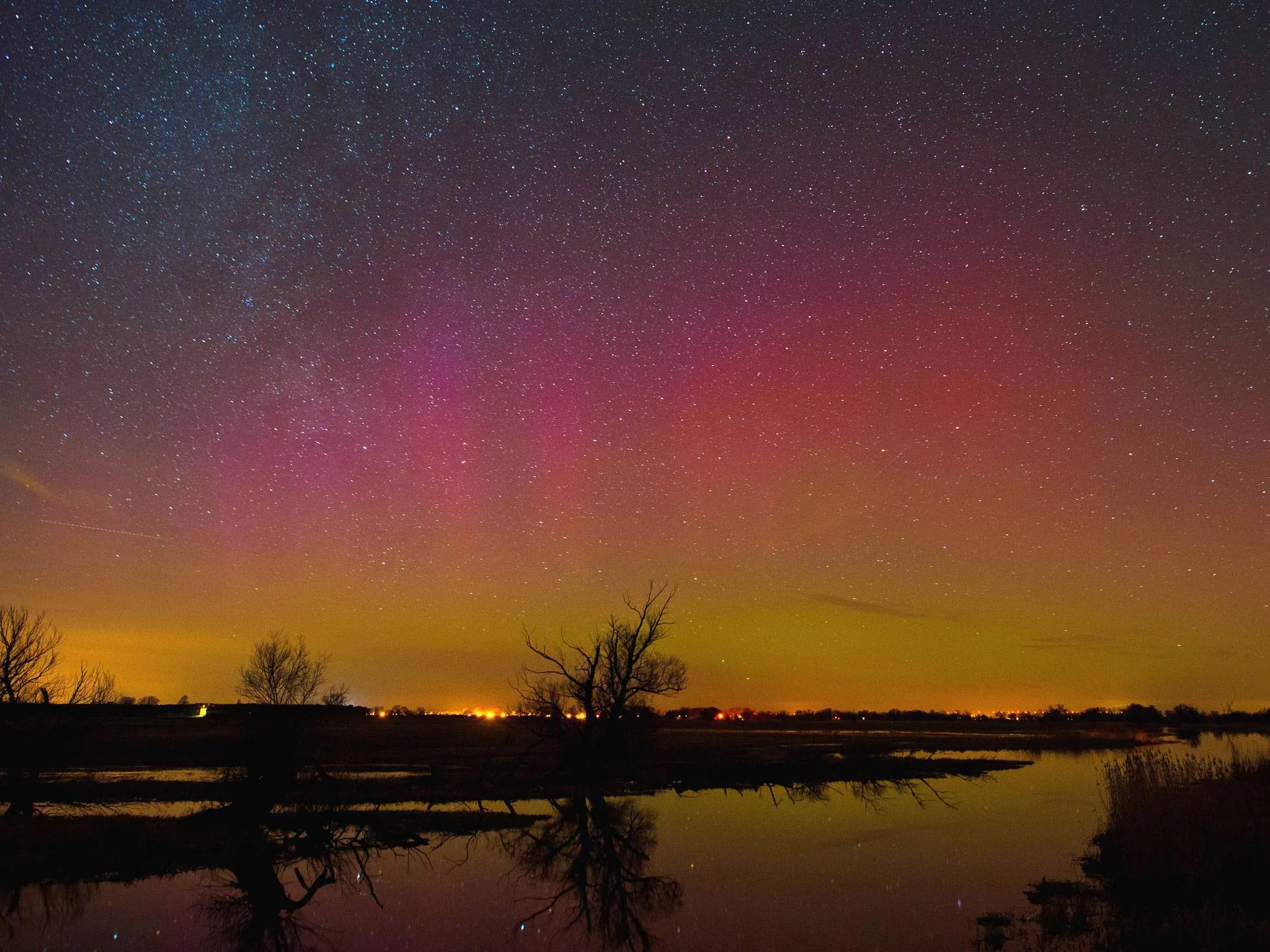 In this picture made available Monday, February 24, 2014, polar lights shine in the sky above Guelper Havel river in Guelpe, northwest of Berlin, Germany. These northern lights are caused by a giant cloud of electric particles of a sun storm in the Earth's atmosphere. Guelpe in nature park Westhavelland is said to be Germany's darkest place. (Photo by Patrick Pleul/AP Photo/DPA)