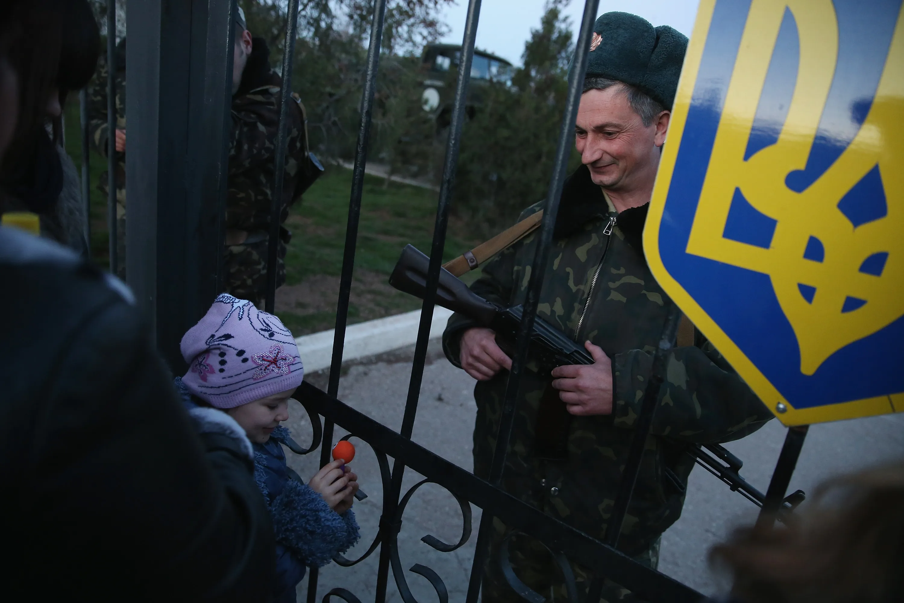 A Ukrainian soldier at the Belbek military base talks with family members, including his daughter, through the gates of the base entrance on March 3, 2014 in Lubimovka, Ukraine. (Photo by Sean Gallup/Getty Images)