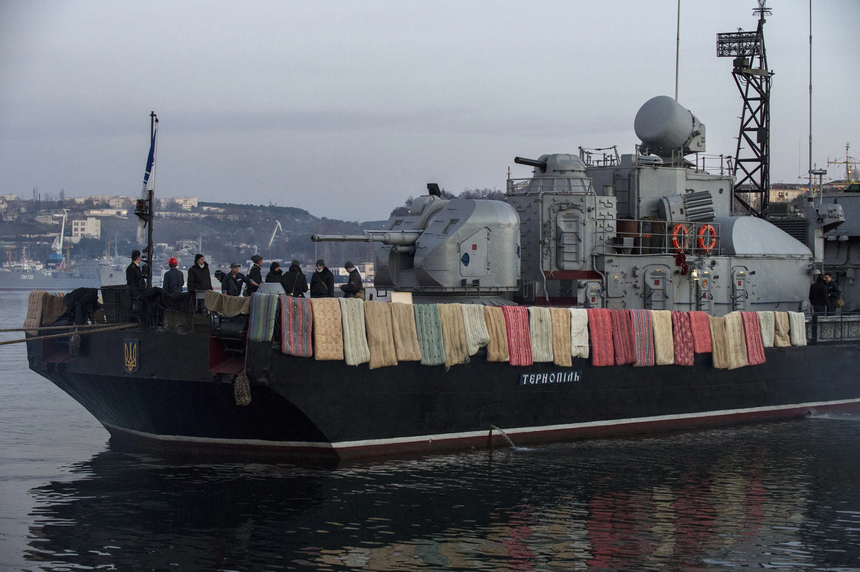 People stand on board the Ukrainian navy corvette Ternopil at harbor of Sevastopol, Ukraine, Monday, March 3, 2014. (Photo by Andrew Lubimov/AP Photo)
