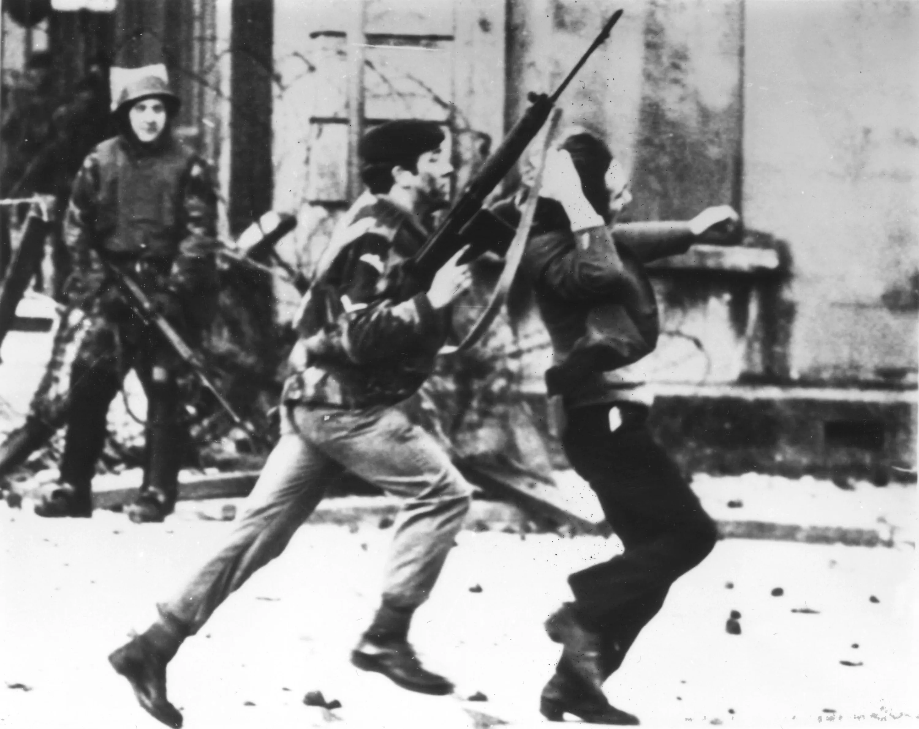 An armed soldier attacks a protestor on Bloody Sunday when British Paratroopers shot dead 13 civilians on a civil rights march in Derry City, on 30th January 1972. (Photo by Frederick Hoare/Central Press/Getty Images)