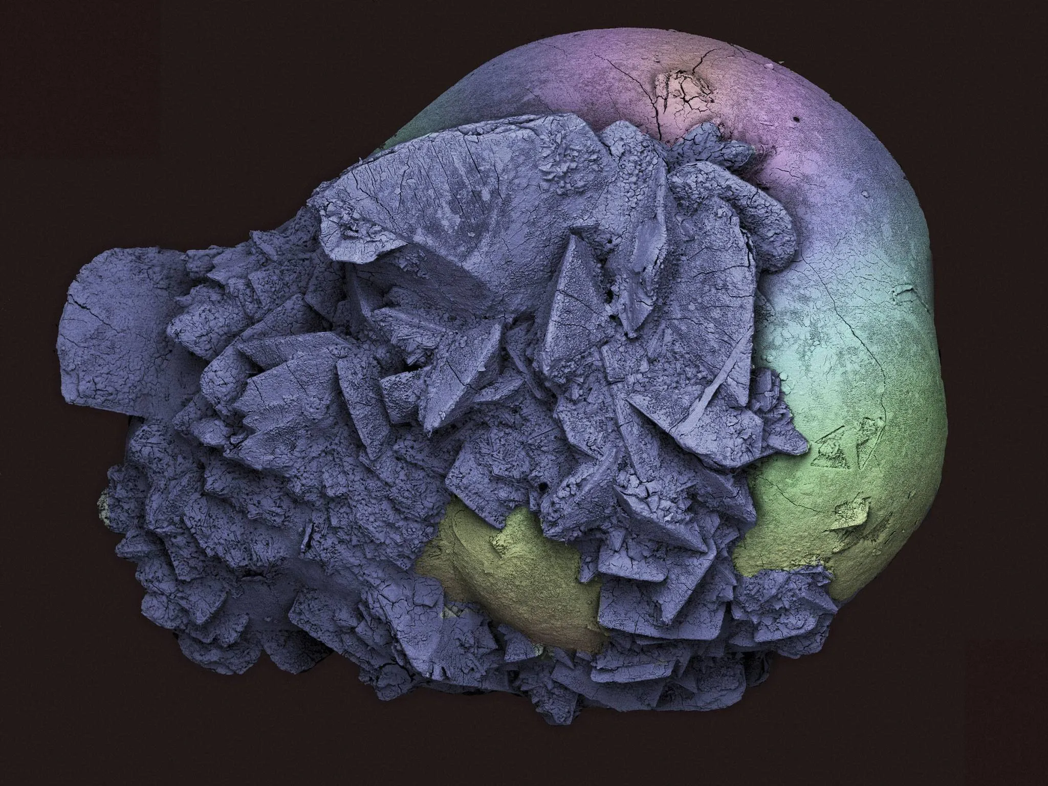 Scanning electron micrograph of a kidney stone (nephrolithiasis). Kidney stones form when salts, minerals and chemicals in the urine (for example calcium, oxalate and uric acid) crystallise and solidify. Small kidney stones are often passed naturally but larger stones can sometimes get lodged in the kidney or other parts of the urinary tract. Size of stone is 2 mm. (Photo by Kevin Mackenzie, University of Aberdeen/Wellcome Images)