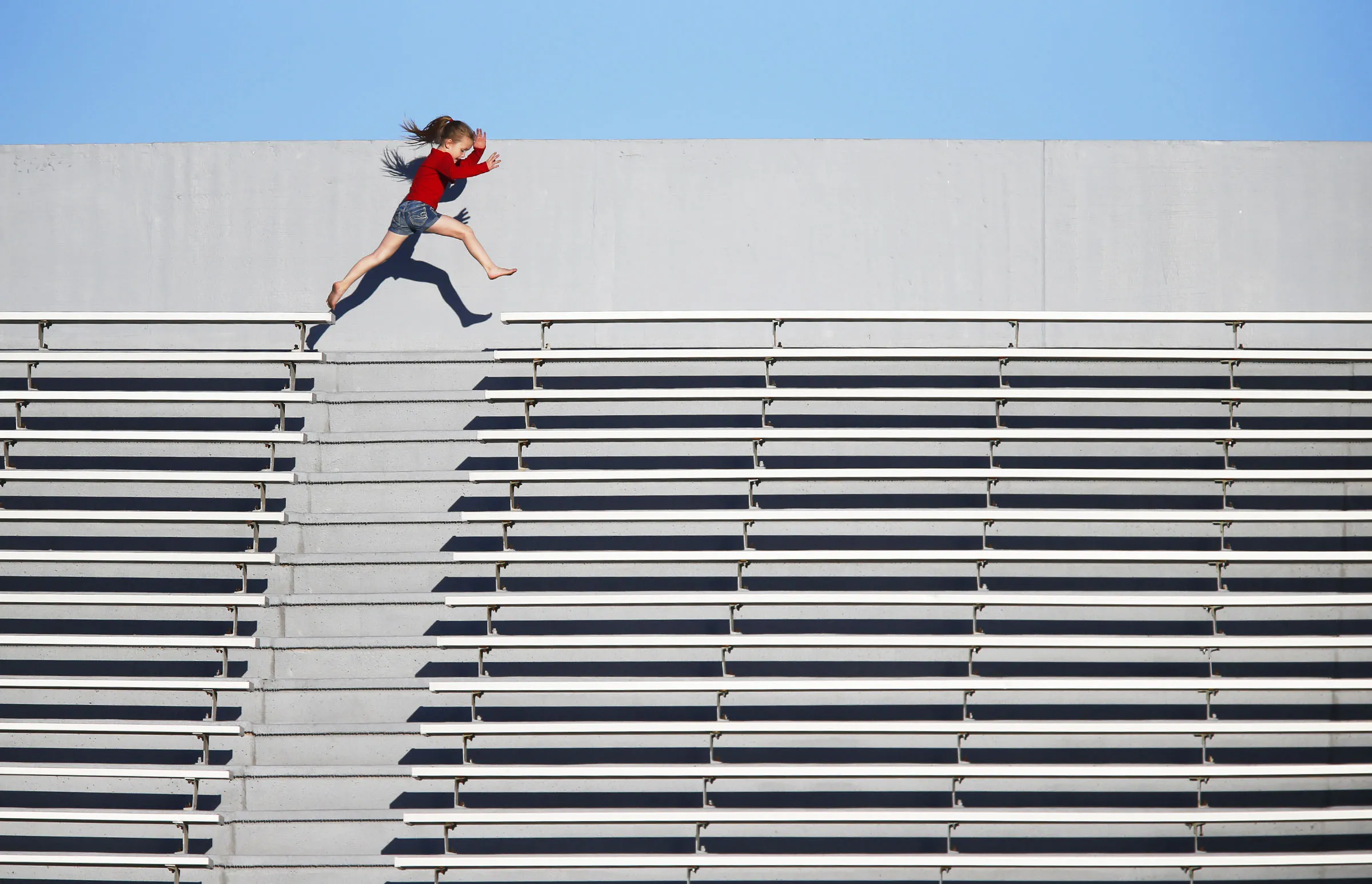 Mekenzie Blanchard, 7, of Tulsa jumps from one side of the bleachers to the other during a soccer game at S.E. Williams Stadium at Booker T. Washington High School on Monday, March 10, 2014. (Photo by Tom Gilbert/AP Photo/Tulsa World)