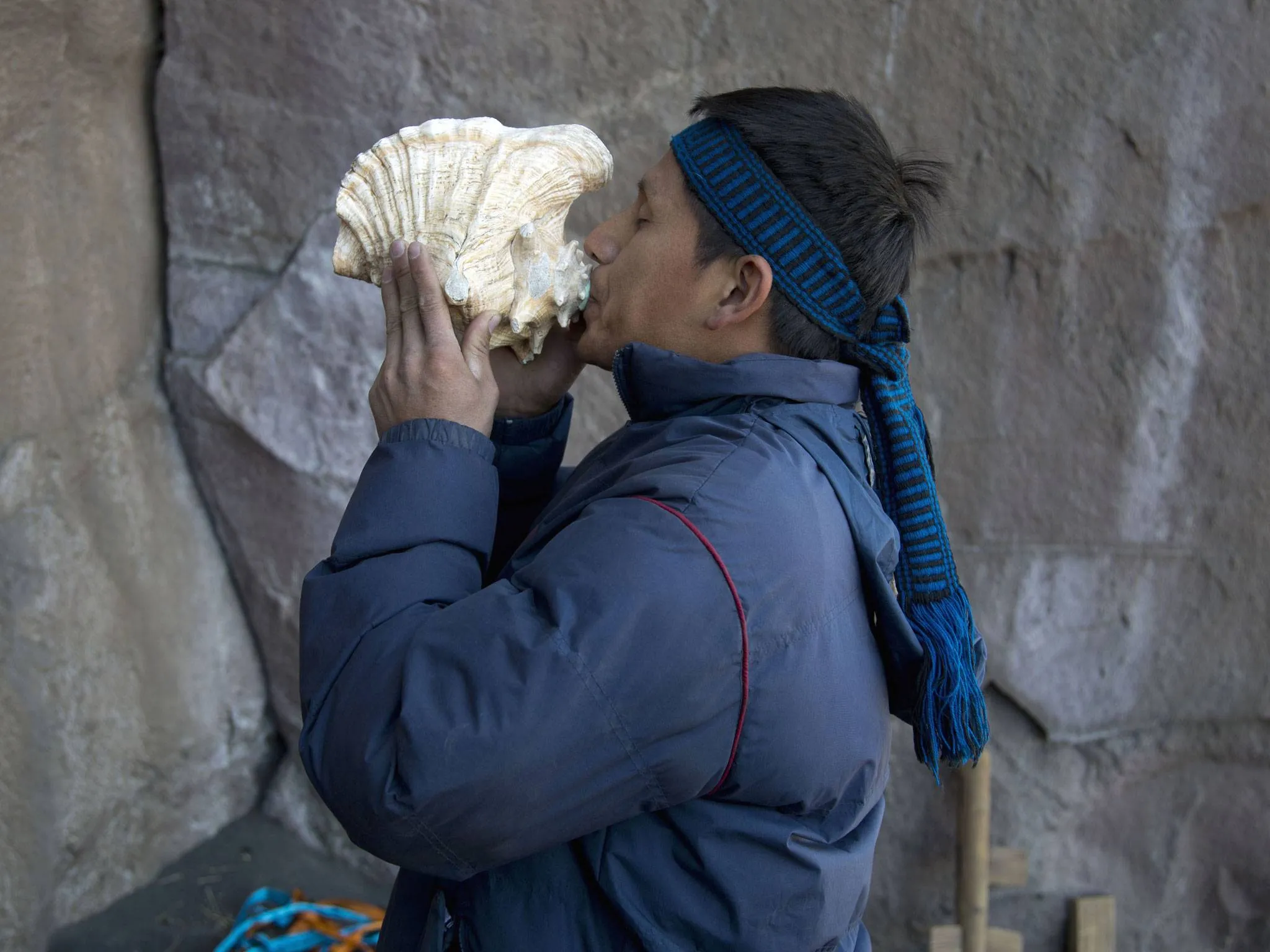 A villagers blows on a conch shell during a ceremony on a rock formation on the slopes of the Popocatepetl volcano. (Photo by Eduardo Verdugo/AP Photo)