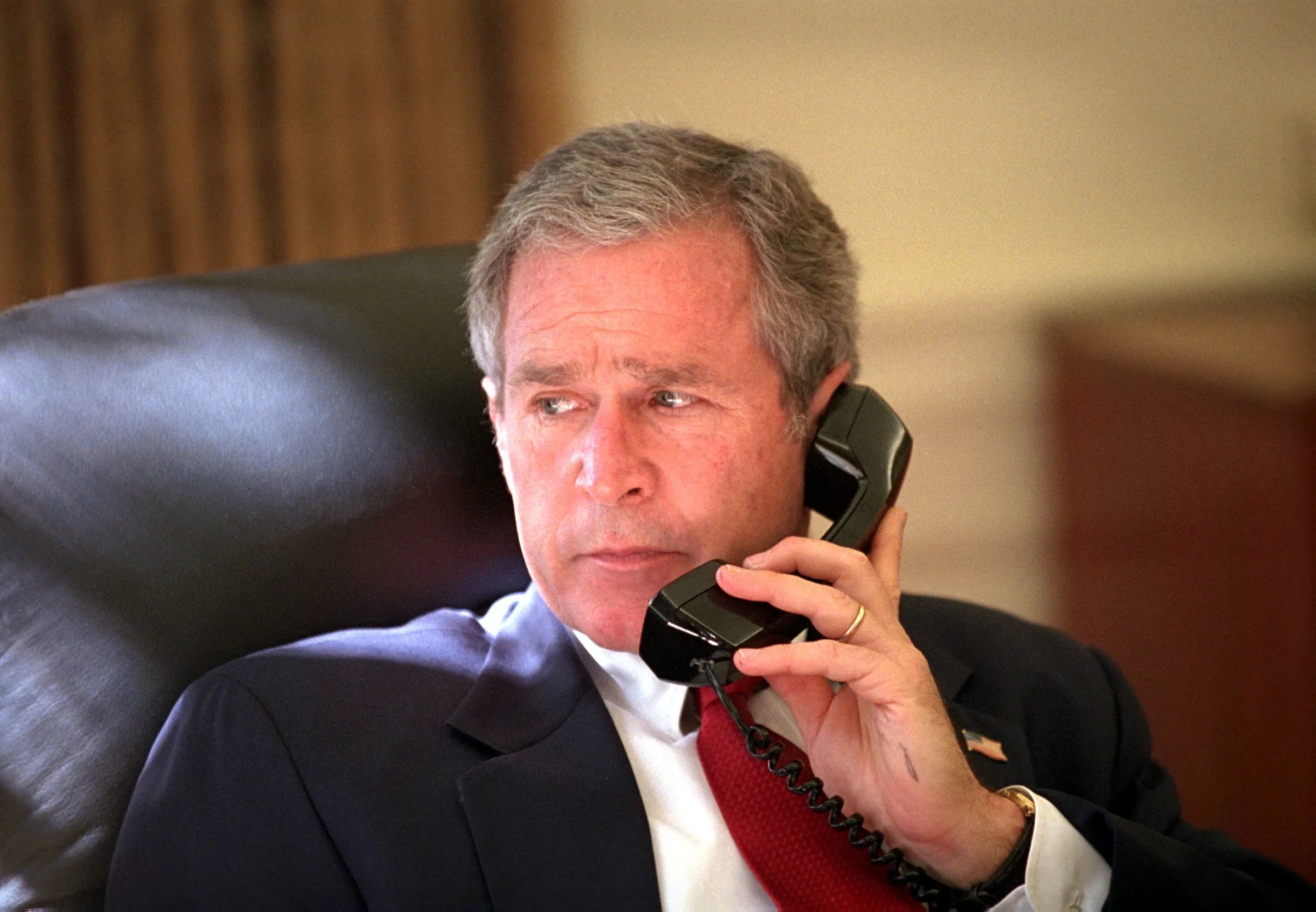 President George W. Bush speaks to Canadian Prime Minister Jean Chretien on the telephone in Washington Sunday, Oct. 7, 2001. Chretien was one of several world leaders Bush spoke to before telling the United States and the world of air strikes against the Taliban. George Walker Bush was the 43rd U.S. President serving from 2001 – 2009. (Photo by Eric Draper/AP Photo/The White House)
