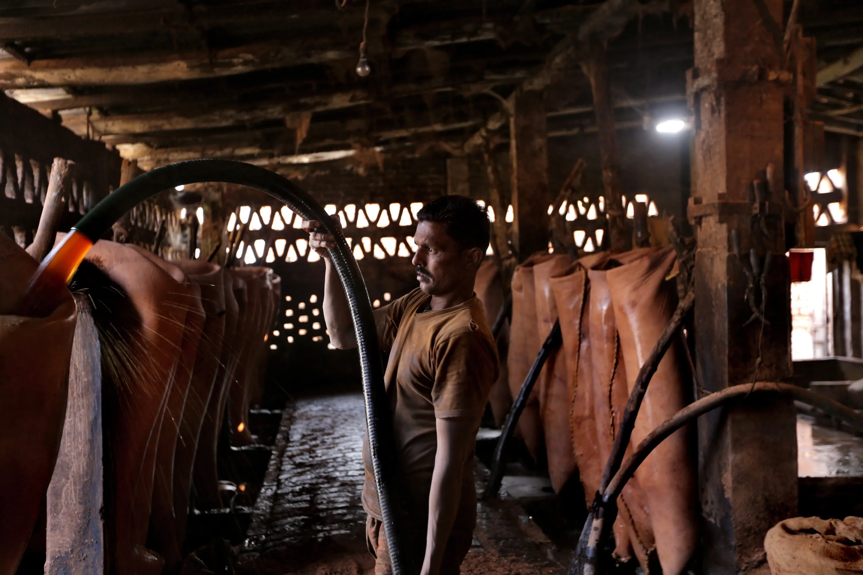 An Indian laborer douses buffalo leather with a salt solution at a tannery workshop in Calcutta, eastern India, 17 February 2014. The leather industry occupies an important place in the Indian economy. It is an employment intensive sector with a vast potential for growth and exports but also a pollution intensive industry that relies on cheap labor. One of the major production centers for leather and leather products is located in Calcutta, West Bengal. Hundreds of tanneries are operated in the city’s Tiljala, Topsia and Tangra districts. They are mostly run by local families living and working under poor conditions. (Photo by Piyal Adhikary/EPA)