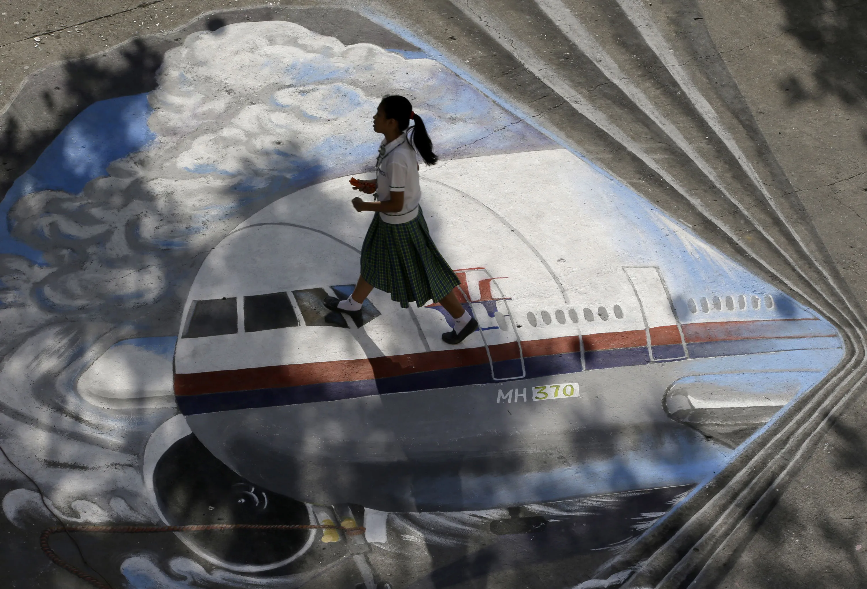 A student from the Benigno “Ninoy” Aquino High School steps on a mural depicting the missing Malaysia Airlines plane Tuesday, March 18, 2014 at their campus at Makati city, east of Manila, Philippines. Officials revealed a new timeline Monday suggesting the final voice transmission from the cockpit of the missing Malaysian plane may have occurred before any of its communications systems were disabled, adding more uncertainty about who aboard might have been to blame. The search for Flight 370, which vanished early March 8 while flying from Kuala Lumpur to Beijing with 239 people on board, has now been expanded deep into the northern and southern hemispheres. (Photo by Bullit Marquez/AP Photo)