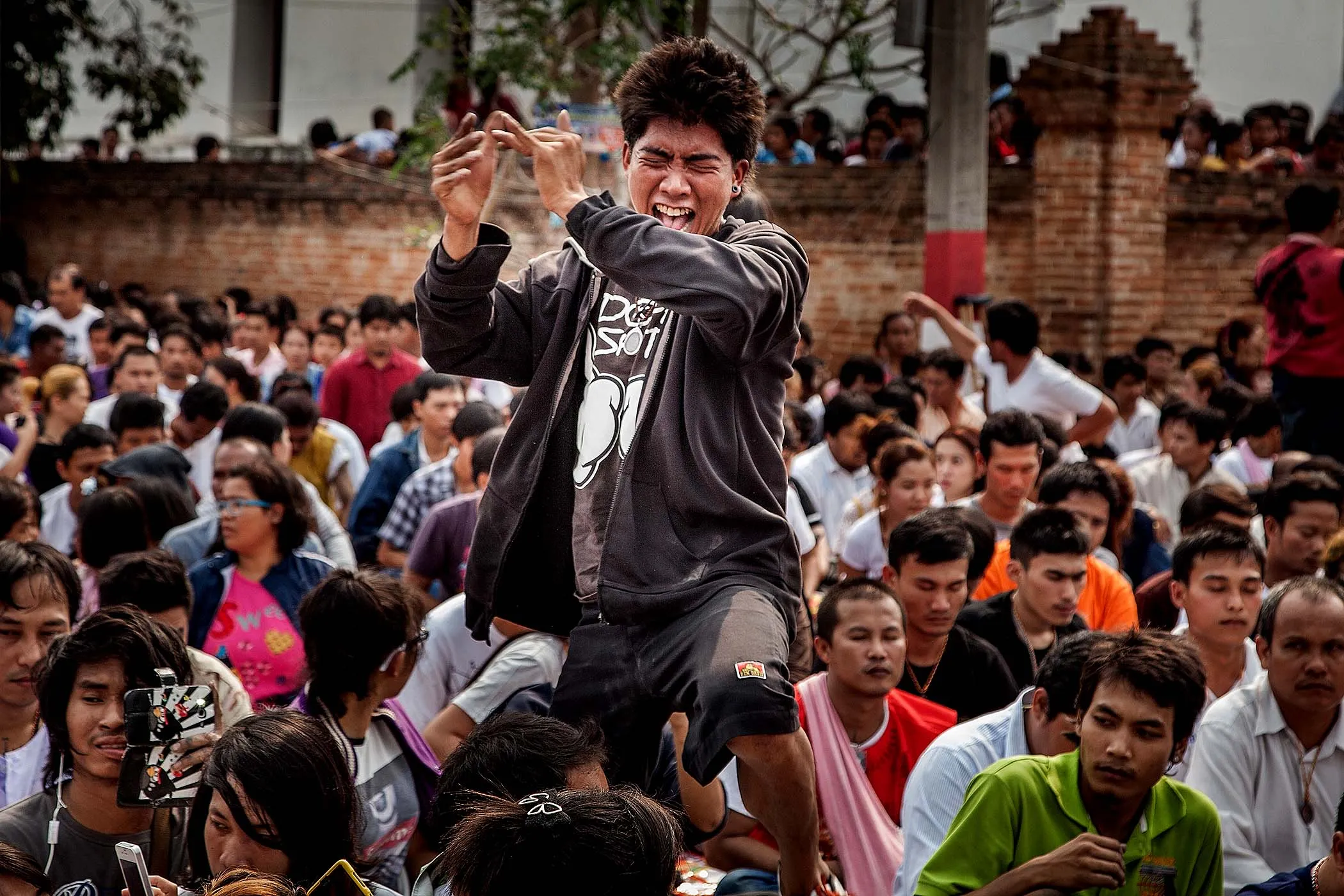 A devotee enters in a state of trance as he tries to pay his respect to a statue of Khru Sak during the celebration of the annual Tattoo festival at Wat Bang Phra, in Nakhon Pathom, Thailand, on March 15, 2014. Thousands of believers from all over Thailand come to take part in one of the country's most bizarre festivals, about 50 miles outside Bangkok, to pay respect to the temple's monks who are master tattooist. In Thai culture the tattoo is worn as a symbol of spiritual and physical protection, and many believe that the tattoo has mystical powers. (Photo by Omar Havana/Getty Images)