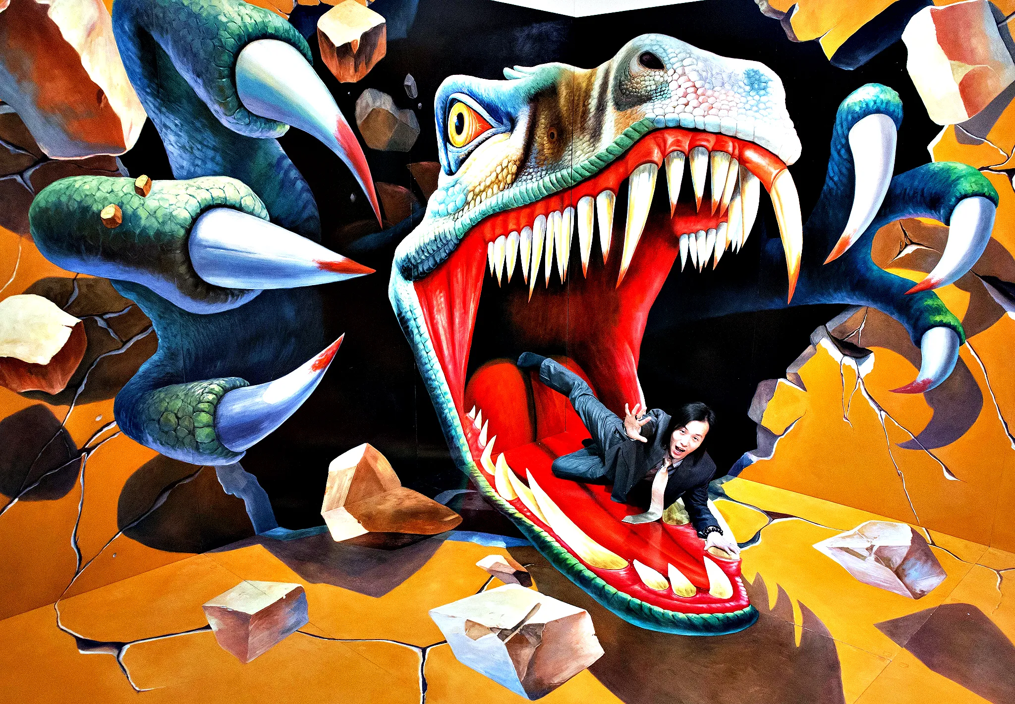 Chinese artist Zhang Xun poses in a installation created in a special 3D-technique during a press preview in the exhibition “You Are The Art” ('Du bist die Kunst') by a Chinese artist group at Augustusburg castle in Augustusburg, Germany, Friday, March 21, 2014. Visitors are invited to take pictures of themselves interacting with the art and to share the results on social networks. The exhibition includes 23 paintings and lasts from March 22, 2014 to June 22, 2014. (Photo by Jens Meyer/AP Photo)