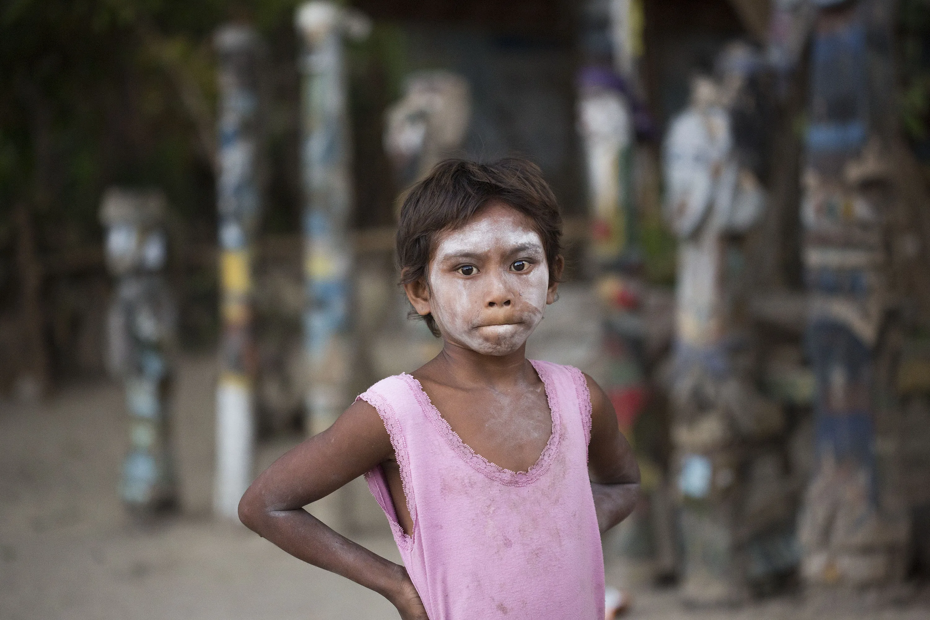 A young Moken boy with his face covered in Thanaka takes a break from playing games in front of the village's spirit poles. February 28, 2013 – Ko Surin, Thailand. (Photo by Taylor Weidman/zReportage via ZUMA Press)
