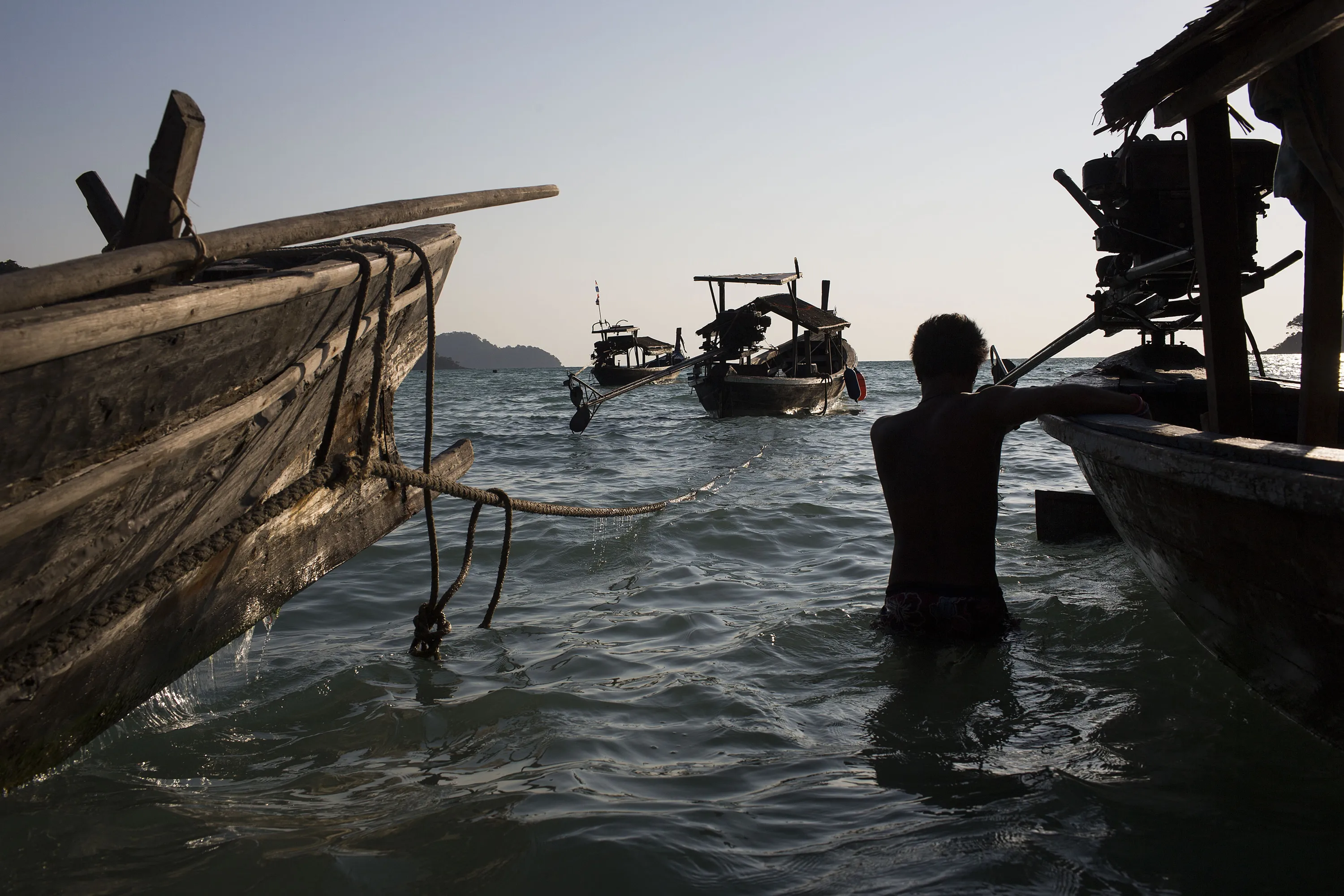 Nguy, an indigenous Moken man, takes his boat out as the tide comes in. The boat on the left (identified by it's unique prow design) is one of only a few Kabang left in the world. Traditionally, Moken would live most of the year aboard Kabang and each boat would hold a nuclear family. February 27, 2013 – Ko Surin, Thailand. (Photo by Taylor Weidman/zReportage via ZUMA Press)